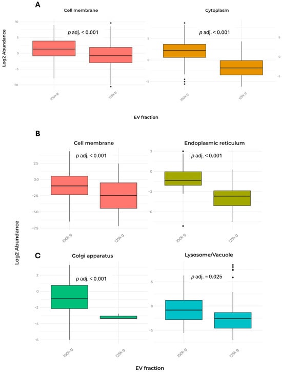Comparison of EV protein abundance in cell compartments in the two fractions. The data report only the localizations that showed significant differences between the two fractions. (A) Box plot of the abundance of proteins shared by the 100k×g and 125k×g fractions. (B,C) Box plot of the abundance of proteins exclusive to the 100k×g or 125k×g fraction, respectively. Box plots show only the groups that exhibited a significant difference (p adj. ≤ 0.05). Protein localization was predicted using DeepLoc-2.1, a web interface tool, which estimates the most probable cell localization on the basis of the highest probable value. Proteins were divided into nine categories (i.e., cell membrane, cytoplasm, endoplasmic reticulum, extracellular, Golgi apparatus, vacuole/lysosome, mitochondrion, nucleus, plastid).