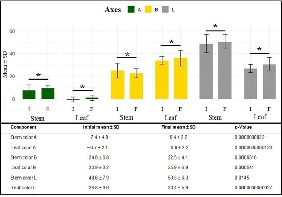 Initial and final mean ± standard deviation (SD) values of color components along the A, B, and L axes of the CIE-LAB system in stems and leaves during marijuana cutting propagation (Cannabis sativa L.). * indicates statistically significant at p < 0.10.