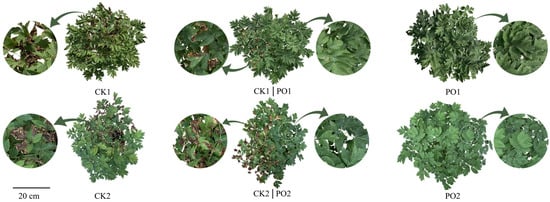 Distinct phenotypic differences in the leaves of potted tree peonies across treatments (Figure 2). Leaves of the control groups (CK1 and CK2) exhibited significant yellowing, with withered leaf margins and tips. In contrast, no obvious leaf scorching was observed in plants under either single-layer (PO1) or double-layer (PO2) PO film treatments. An intriguing phenomenon was noted at the junction between control and PO film-covered areas: potted plants displayed a clear “Yin-Yang face” effect. Specifically, leaves on the control side of the same plant showed yellowing, withering, and damage along the margins, while leaves on the PO film-covered side remained intact without visible injury. Therefore, both single-layer and double-layer PO film treatments effectively protected the potted tree peonies, maintaining healthy growth under intense light and high temperature stress conditions.