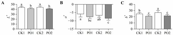 Differences in leaf color of potted tree peony under natural light and PO film. (A) The L* value represents the brightness of the leaf, with 0–100 indicating the range from black to white. (B) The a* value represents the red–green color of the leaf. A positive value indicates red, while a negative value indicates green. (C) The b* value represents the yellowish-blue color of the leaf. Positive values indicate yellow, while negative values indicate blue. CK1, control of multi-span greenhouse 1; PO1, single-layer PO film treatment for multi-span greenhouse 1; CK2, multi-span greenhouse 2 control; PO2, treatment with double-layer PO film in multi-span greenhouse 2. Data is presented as means ± SE of ten biological replicates. Means with different letters indicate a significant difference (p < 0.05) between CK and PO film.
