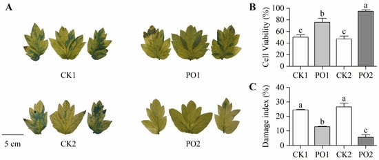 Changes in cell viability and damage index of potted tree peony leaf under natural light and PO film. (A) Staining of Evans blue solution in potted tree peony leaf. (B) Cell viability of potted tree peony leaf by Evans blue dye method. (C) Damage index of potted tree peony leaf. CK1, control in multi-span greenhouse 1; PO1, single-layer PO film treatment in multi-span greenhouse 1; CK2, multi-span greenhouse 2 control; PO2, treatment with double-layer PO film in multi-span greenhouse 2. Data is presented as means ± SE of ten biological replicates. Means with different letters indicate significant difference (p < 0.05) between CK and PO film.