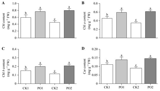The results of the pigment content determination of the leaves showed that the total Chlorophyll (Chl) content, Chlorophyll a (Chl a), and Chlorophyll b (Chl b) in PO1-treated potted tree peony leaves were significantly higher than those in CK1, by 28.99%, 30.12%, and 32.51%, respectively (Figure 5A–C). Similarly, PO2-treated potted tree peony leaves exhibited significantly higher total Chl, Chl a, and Chl b levels than CK2, with increases of 76.08%, 81.99%, and 77.03%, respectively. Measurement of carotenoid (Car) content revealed that PO1-treated potted tree peony leaves had 25.11% higher Car levels than CK1 (Figure 5D), while PO2-treated potted tree peony leaves showed a 61.91% increase compared to CK2.