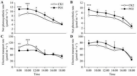 The results of electron transport rate (ETR) showed (Figure 6C,D) that from 8:00 to 12:00, the ETR of the potted tree peony leaves in the PO1 pot was significantly higher than that of CK1, by 18.77% and 33.58%, and at 8:00, the ETR of the potted tree peony leaves in the PO2 pot was significantly higher than that of CK2 by 9.89%.