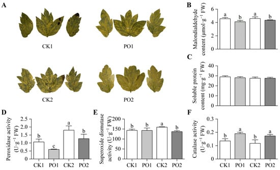 There was a significant superoxide anion (O2·−) accumulation in leaves of the CK1 and CK2 treatments, whereas markedly less accumulation was observed in the PO1 and PO2 treatments (Figure 7A). Malondialdehyde (MDA) is a product accumulated after plant cell membrane damage. This study found (Figure 7B) that the MDA content in leaves of CK1 was significantly higher (by 10.91%) than that in PO1, and CK2 was significantly higher (by 5.73%) than PO2. This indicates that both PO1 and PO2 treatments significantly reduced the degree of membrane damage in tree peony leaves under environmental stress. No significant differences were observed in soluble protein (SP) content among the leaves of potted tree peonies across all treatments (Figure 7C).