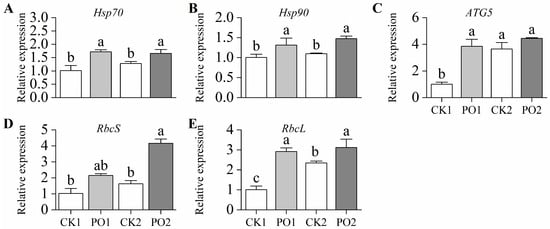 In this study, the gene expression levels of Hsp70 and Hsp90 in leaves of potted tree peonies under the PO1 treatment were extremely significantly higher than those in CK1, being 1.70 and 1.30 times higher, respectively. Similarly, under the PO2 treatment, their expression levels were considerably higher than those in CK2, by 1.31 and 1.35 times, respectively (Figure 8A,B). In this study, the expression level of ATG5 in leaves under the PO1 treatment was extremely significantly higher than that in CK1, reaching 3.83 times that of the latter. However, no significant difference was observed between PO2 and CK2 (Figure 8C).