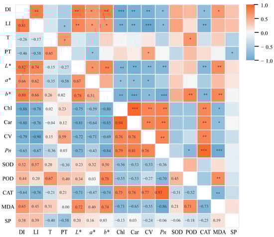 Correlation analysis between the damage index and each index. DI, Damage index. LI, Light intensity. T, Ambient temperature. PT, Pot temperature. L*, Lightness. a*, Red–green values. b*, Yellow–blue values. Chl, Chlorophyll content. Car, Carotenoid content. CV, Cell viability. Pn, Net photosynthetic rate. SOD, Superoxide dismutase. POD, Peroxidase. CAT, Catalase. MDA, Malondialdehyde. SP, Soluble protein. The correlations among the various indicators were analyzed using Spearman correlation.
