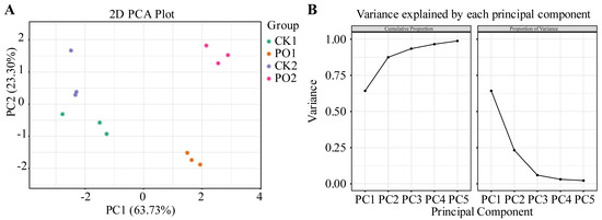 The results of the PCA are presented in Figure 10. Two principal components (PC) were extracted, with contribution rates of 63.73% and 23.30%, respectively, and a cumulative contribution rate of 87.03%, effectively explaining the variability in the sample indicators. Further observation revealed that in the PCA graph, the first principal component could effectively separate CK1 and CK2 from PO1 and PO2, while the second principal component had a closer distance between CK1 and PO1.