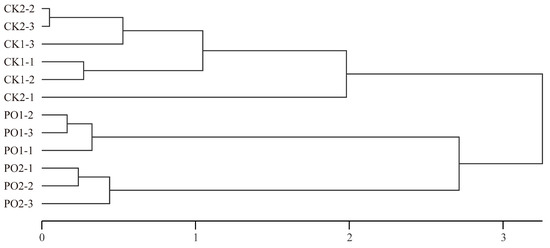 Cluster analysis of principal component scores of samples with different treatments. CK1, control in multi-span greenhouse 1; PO1, single-layer PO film treatment in multi-span greenhouse 1; CK2, multi-span greenhouse 2 control; PO2, treatment with double-layer PO film in multi-span greenhouse 2.