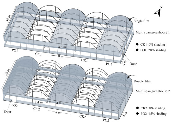 The experiment was conducted from April to September 2024 at a potted tree peony cultivation base in Luoyang (34°43′59″ N, 112°23′23″ E, altitude 212 m), China. PO film coverage treatments were initiated after spring flowering, using PO film supplied by Shanghai Plusuck Plastic Co., Ltd. (Shanghai, China). The trial was carried out in two adjacent multi-span arched greenhouses with specifications shown in the model in Figure 12. Multi-span greenhouse 1: Alternating treatments of no roof coverage (CK1) and single-layer PO film coverage (PO1). Each north–south-oriented greenhouse contained 12 bays, with each treatment replicated three times. Side PO films were rolled up on all four sides to ensure normal ventilation. Multi-span greenhouse 2: Alternating treatments of no roof coverage (CK2) and double-layer PO film coverage (PO2). Each north–south-oriented house contained seven bays, with each treatment replicated three times. PO films on the northern and southern sides were rolled up to maintain proper ventilation. Five-year-old potted tree peony ‘Luoyanghong’ plants were moved into the greenhouses in mid-April 2024. Plants were cultivated in plastic pots with an upper diameter of 30 cm, a bottom diameter of 24 cm, and a height of 30 cm, using peat soil as the cultivation substrate, accounting for about 90% of the plastic pots. The planting density was approximately two plants per square meter, with all plants receiving automated, integrated water and fertilizer management.