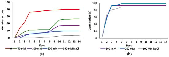 For the germination trials, seeds were placed in standard 90 mm Petri dishes containing two layers of filter paper. The papers were moistened with either 5 mL of distilled water (serving as the control) or with solutions of 50, 100, 200, and 300 mM NaCl, to impose increasing levels of salt stress. Each experimental condition included four replicates, with 25 seeds placed in each Petri dish. Germination was carried out in a controlled environment using an EGH1501HR germination chamber (EQUiTEC, Madrid, Spain), with a temperature cycle set to 30 °C for 16 h and 20 °C for 8 h, maintaining a relative humidity of 65%.