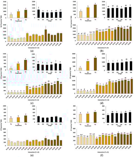 Ion content in roots (a,c,e) and leaves (b,d,f) of Limonium irtaense plants grown from seeds germinated in the indicated conditions (O1: 0 mM NaCl, O2: 50 mM NaCl, O3: 100 mM NaCl, O4: R100, O5: R200, and O6: R300, where R100, R200, and R300 refer to germination recovery treatments) after one month of watering with 0 (T1), 300 (T2) and 600 mM (T3) NaCl solutions. The values represent means ± SE (n = 3 for control treatments, germination without salt; n = 5 for seed germination in 100 mM NaCl; n = 10 for all other treatments). Different lowercase letters indicate significant post hoc pairwise differences according to the Tukey test at p ≤ 0.05 between salt treatments in the greenhouse (treatment), seed germination conditions (origin) and their interaction (T × O).