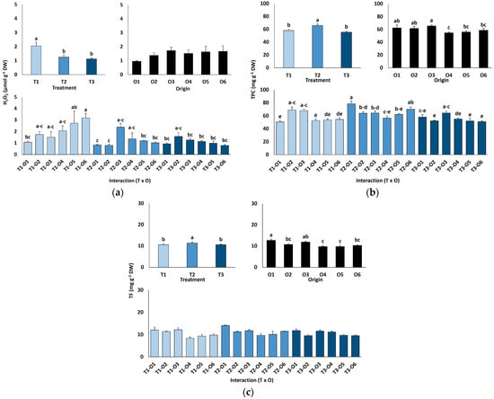 Hydrogen peroxide content (a), total phenolic compounds (b) and total flavonoids content (c) of Limonium irtaense plants grown from seeds germinated in the indicated conditions (O1: 0 mM NaCl, O2: 50 mM NaCl, O3: 100 mM NaCl, O4: R100, O5: R200, and O6: R300, where R100, R200, and R300 refer to germination recovery treatments) after one month of watering with 0 (T1), 300 (T2) and 600 mM (T3) NaCl solutions. The values represent means ± SE (n = 3 for control treatments, germination without salt; n = 5 for seed germination in 100 mM NaCl; n = 10 for all other treatments). Different lowercase letters indicate significant post hoc pairwise differences according to the Tukey test at p ≤ 0.05 between salt treatments in the greenhouse (treatment), seed germination conditions (origin) and their interaction (T × O).