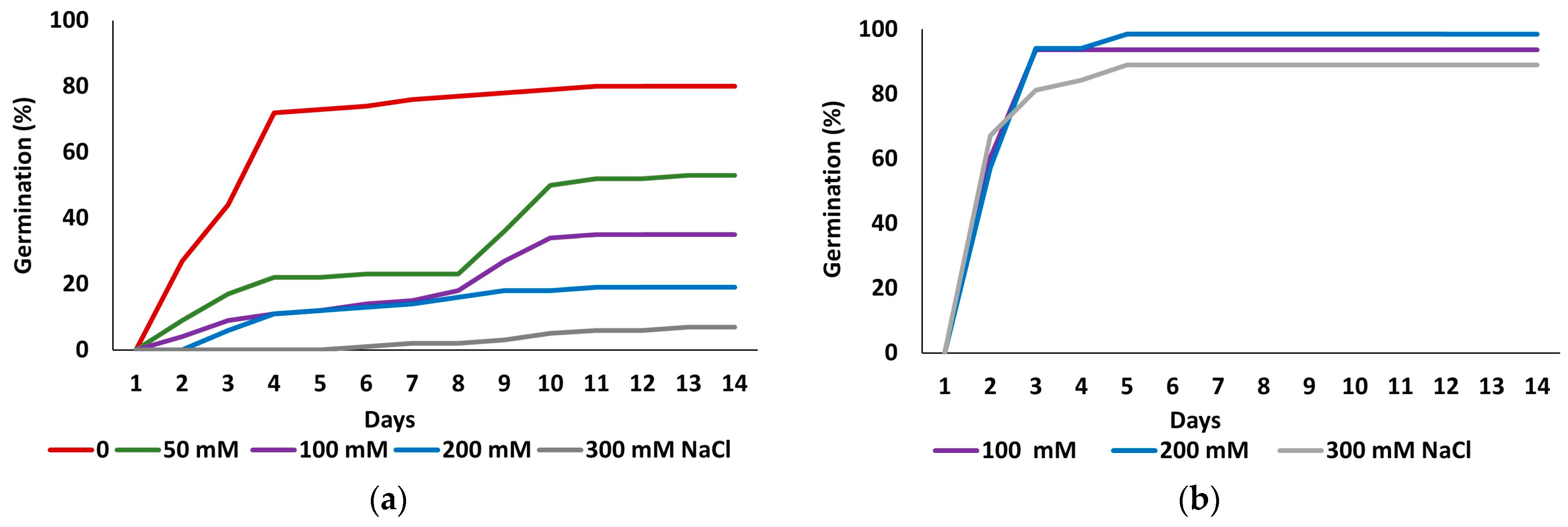 3.1. Germination Responses to Salt Stress and Halopriming Effects