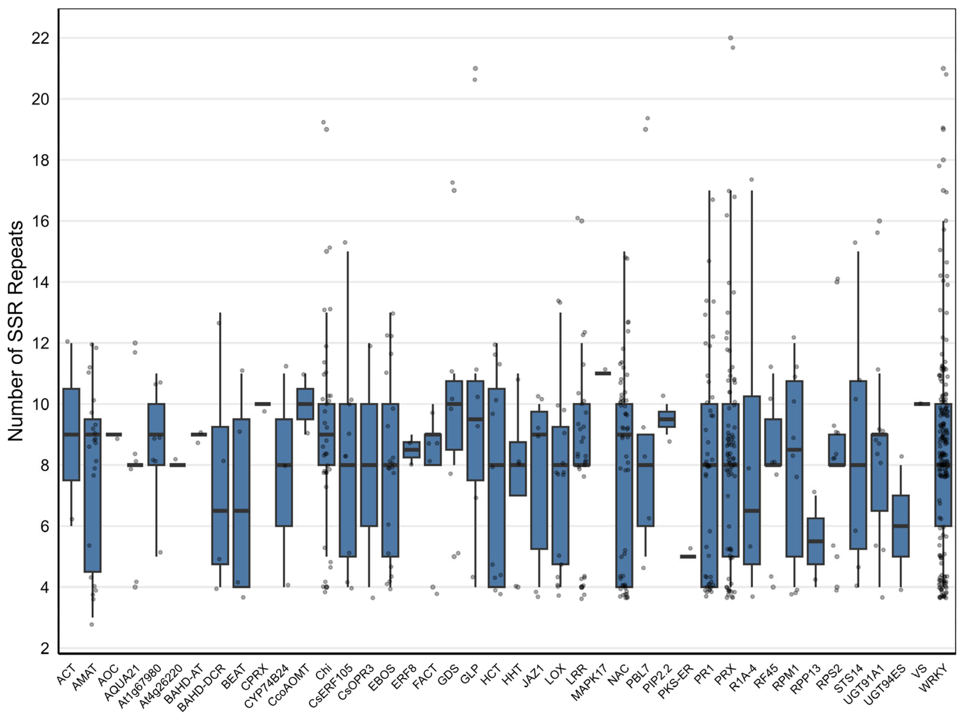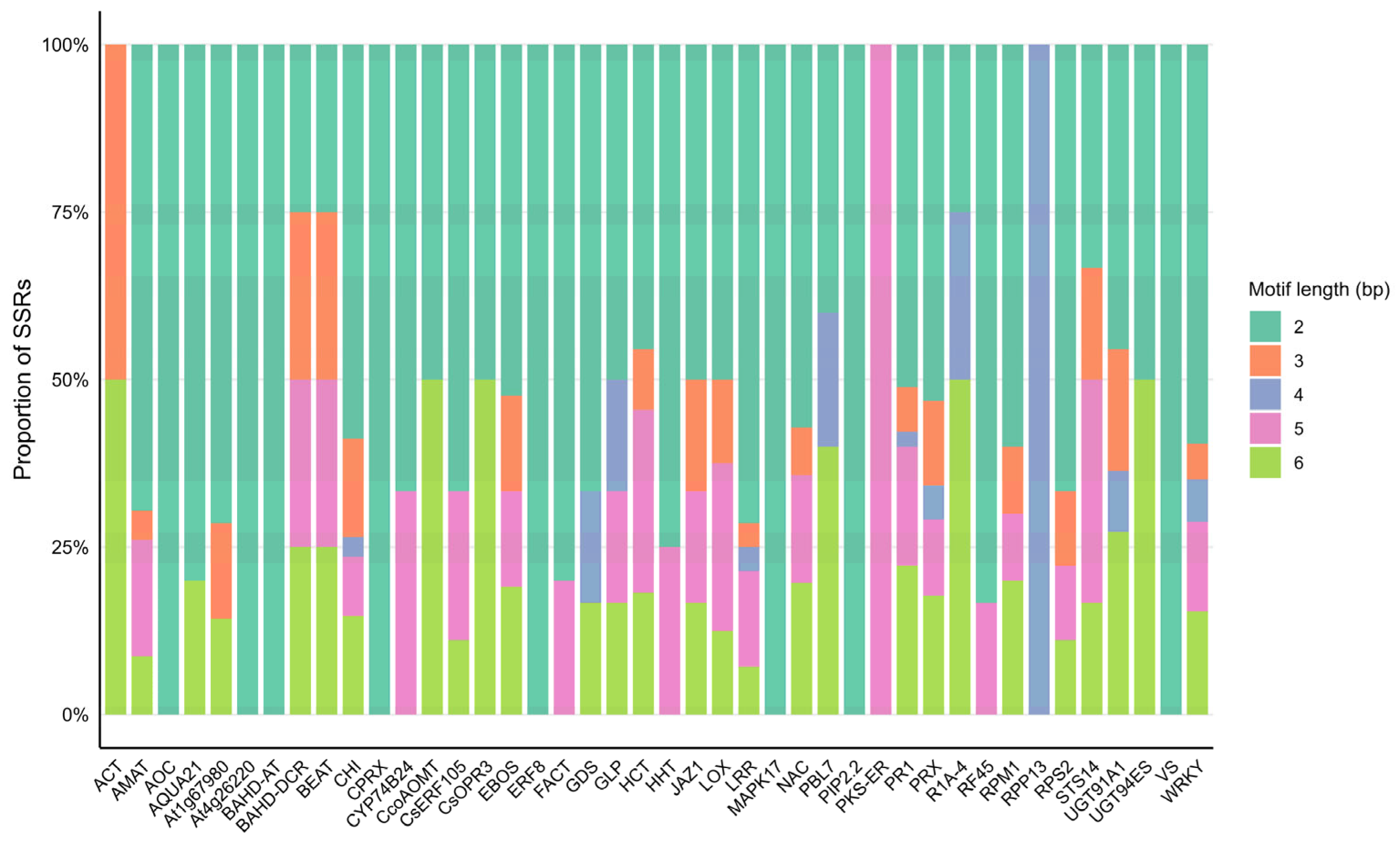 - Sureshkumar, S.; Chhabra, A.; Guo, Y.; Balasubramanian, S. Simple sequence repeats and their expansions: Role in plant development, environmental response and adaptation. New Phytol. 2025, 247, 504–517. [Google Scholar] [CrossRef]