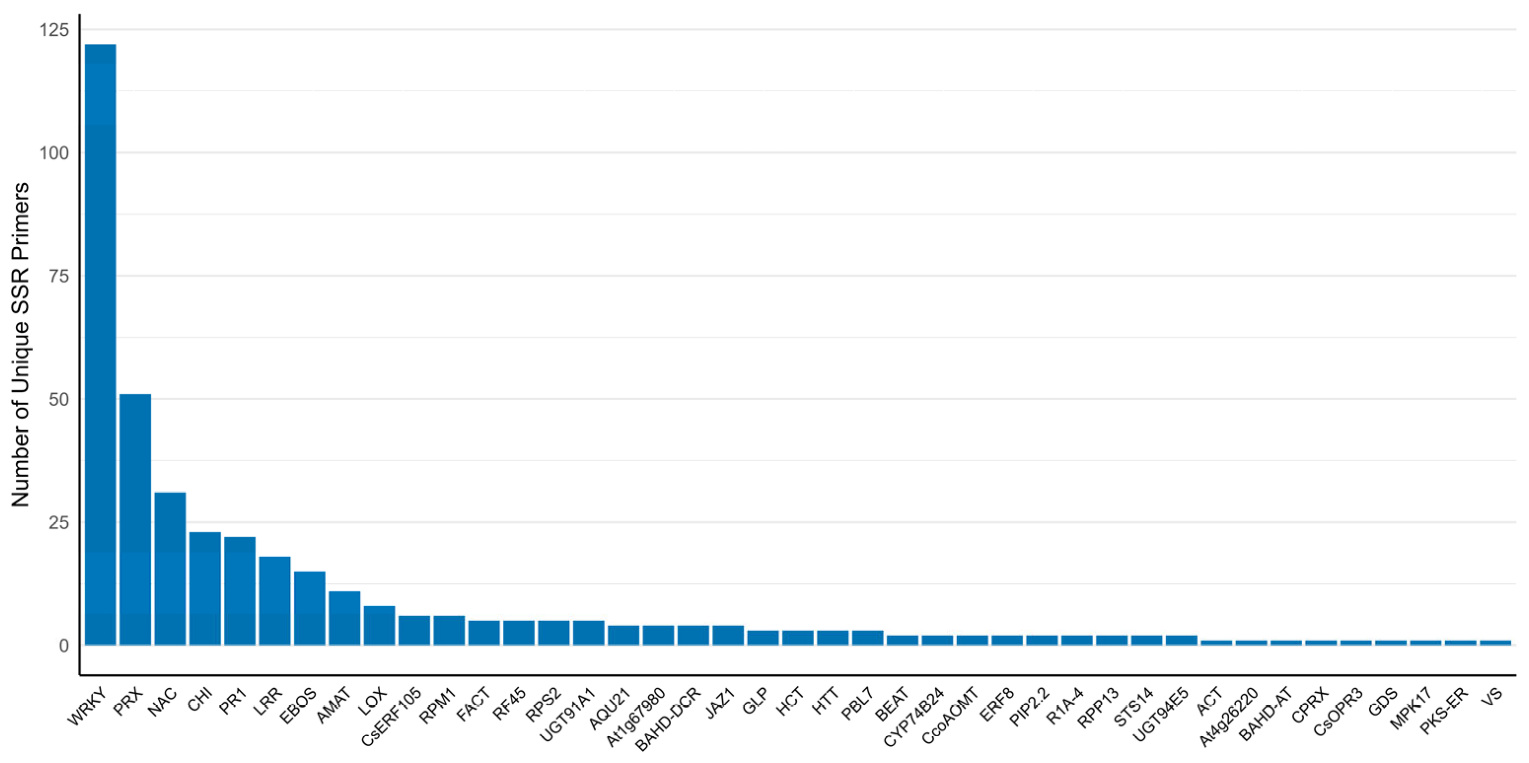 Identification and Development of Pathogen- and Pest-Specific Defense–Resistance-Associated SSR Marker Candidates Assisted by Machine Learning and Discovery of Putative QTL Hotspots in Camellia sinensis