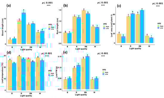 Interaction effects of light quality and vapor pressure deficit (VPD) treatments on growth traits of in vitro grown pistachio plantlets, (a) shoot length; (b) root length; (c) leaf area; (d) leaf temperature, and (e) leaf fresh weight (Leaf FW) in controlled laboratory environment. RB, red-blue; R, red; B, blue; W, white; Low, low vapor pressure deficit; High, high vapor pressure deficit. Each treatment consisted of six biological replicates. Statistical significance at the 0.001 probability level is indicated by ***. In each figure, letters denote statistically significant groupings; treatments sharing at least one letter are not significantly different at the 0.001 probability level.