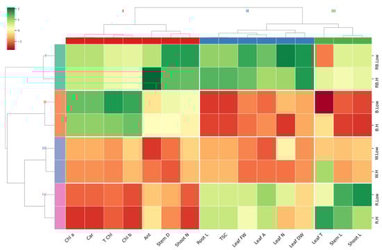 Heatmap with Euclidean distance-based hierarchical clustering on growth and physiological traits. Stem L; stem length, Stem D; stem diameter, Shoot L; shoot length, Root L; root length, Shoot N; number of shoots, Leaflet N; number of Leaflets, Leaf DW; leaf dry weight, Leaf FW; leaf fresh weight, Leaf T; leaf temperature, Leaf A; leaf area, Car; carotenoid, TSC; total soluble carbohydrate, Chl a; chlorophyll a, Chl b; chlorophyll b, T Chl; total chlorophyll, Ant; anthocyanin.