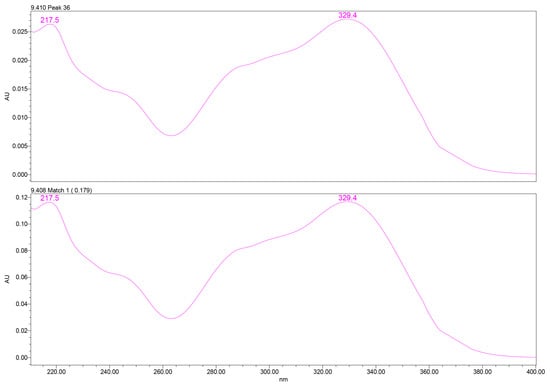 UV–PDA spectral profile of verbascoside extracted from GtE (up) vs. reference verbascoside (down), showing characteristic λmax at 329.4 nm. UV–PDA: Ultraviolet–photodiode array.