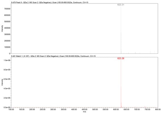QDa mass spectrum of verbascoside in the GtE (m/z 623.3 [M–H]−) (up) vs. reference verbascoside (m/z 623.3 [M–H]−) (down).