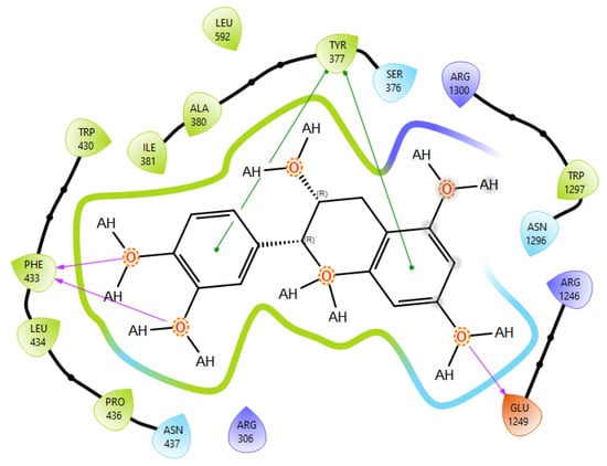 Epicatechin best docking pose at SUR1 binding site. Green line was used to mark π-π interaction while violet arrow was used for hydrogen bond.