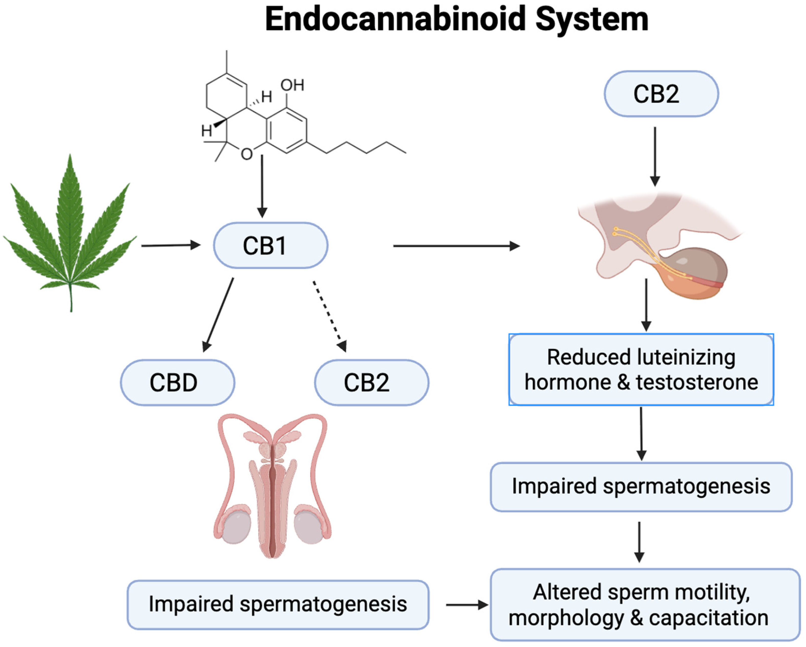 - Payne, K.S.; Mazur, D.J.; Hotaling, J.M.; Pastuszak, A.W. Cannabis and male fertility: A systematic review. J. Urol. 2019, 202, 674–681. [Google Scholar] [CrossRef]