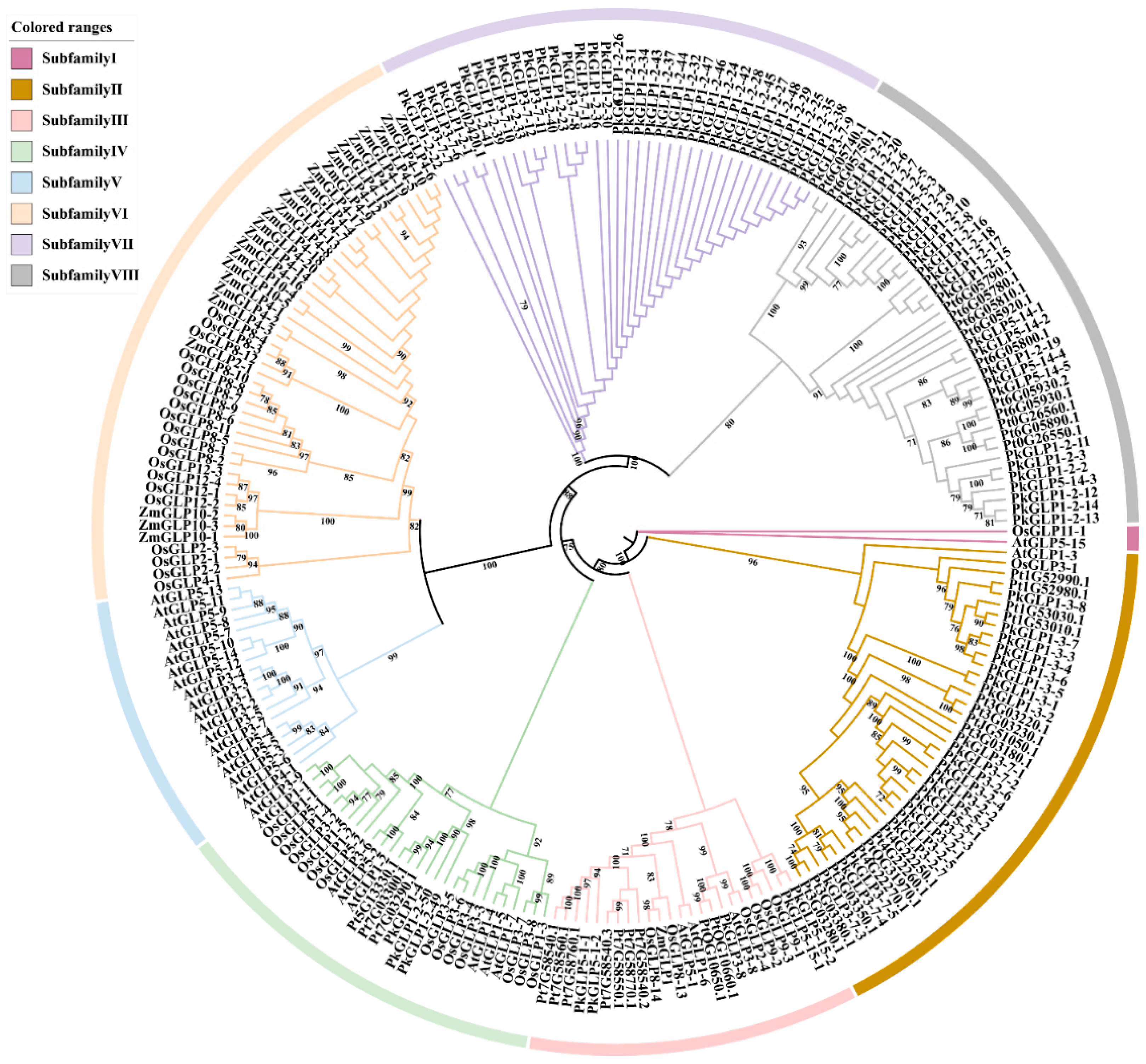 2.3. Family Phylogenetic Tree of PkGLP Gene Family