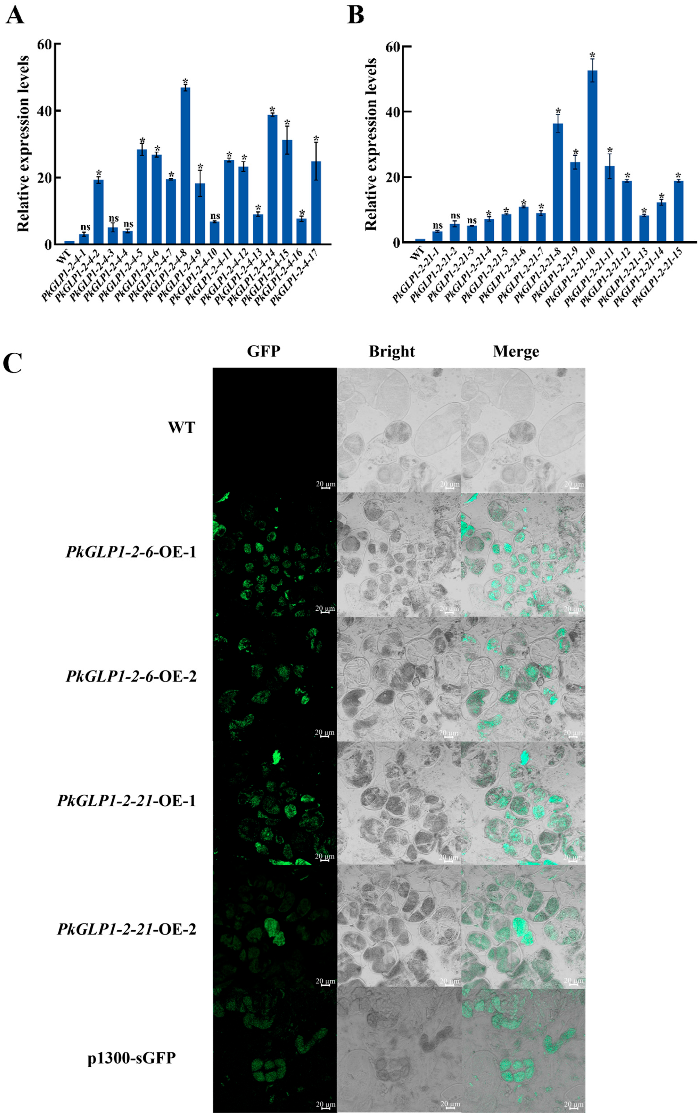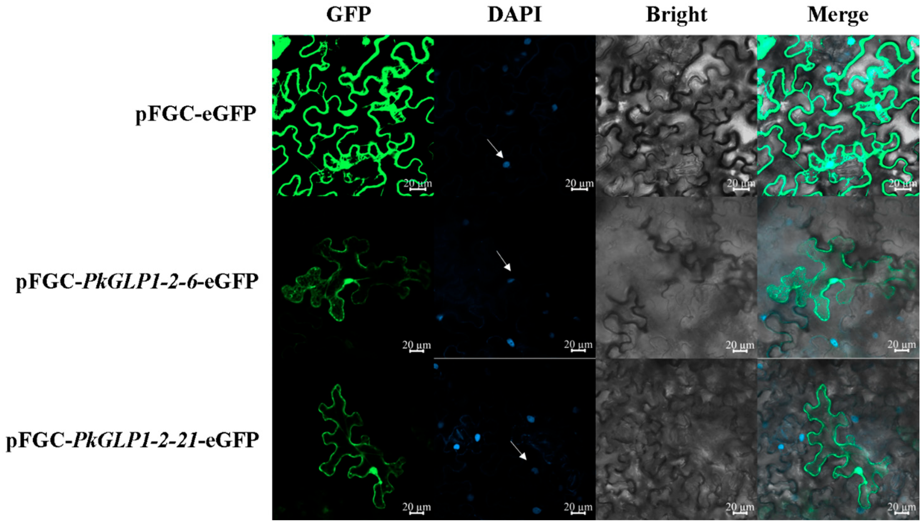 2.9. Subcellular Localization of PkGLP1-2-6 and PkGLP1-2-21 Proteins in Tobacco