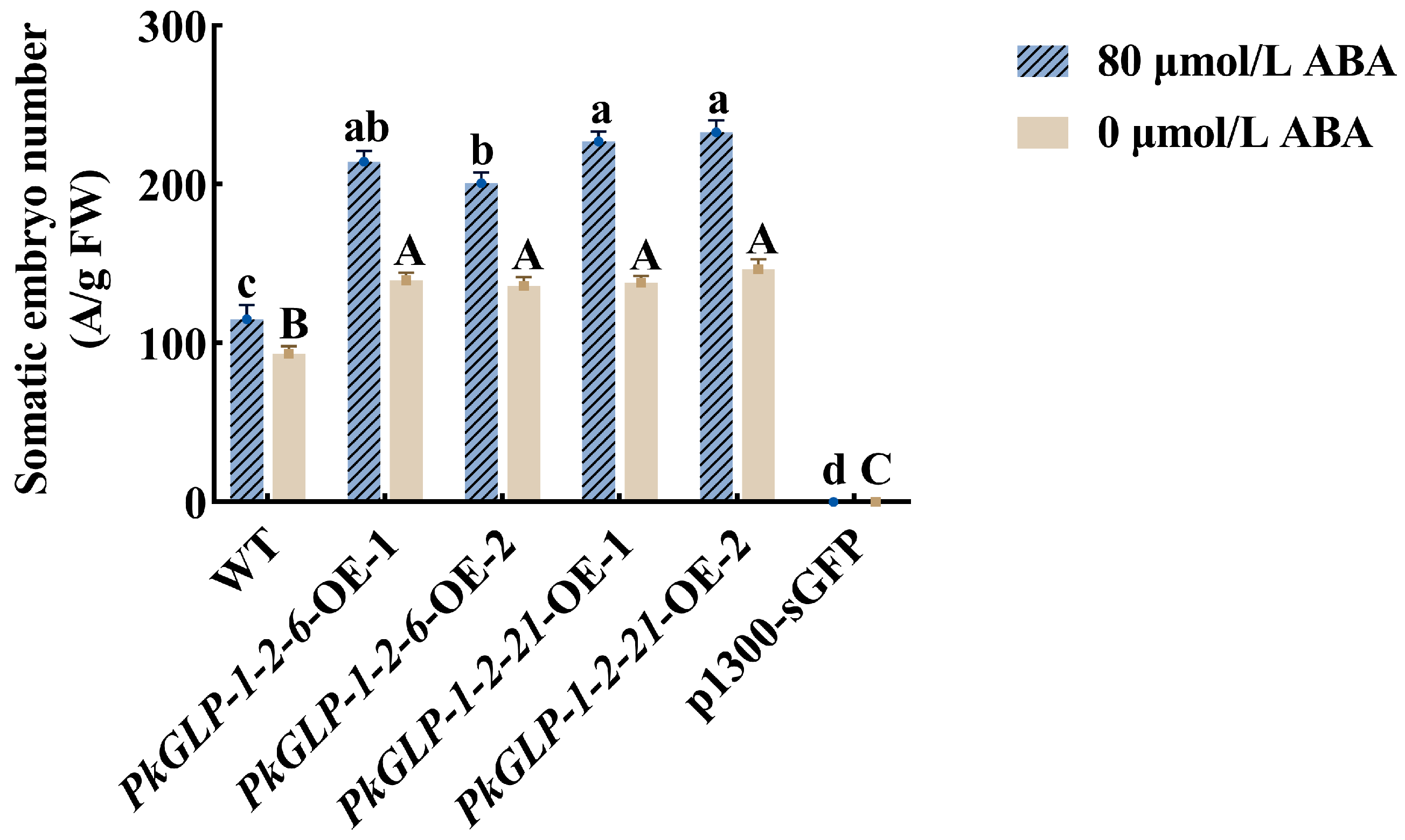 2.10. Screening of PkGLP1-2-6 and PkGLP1-2-21 Transgenic Callus and Somatic Embryo Maturation Culture