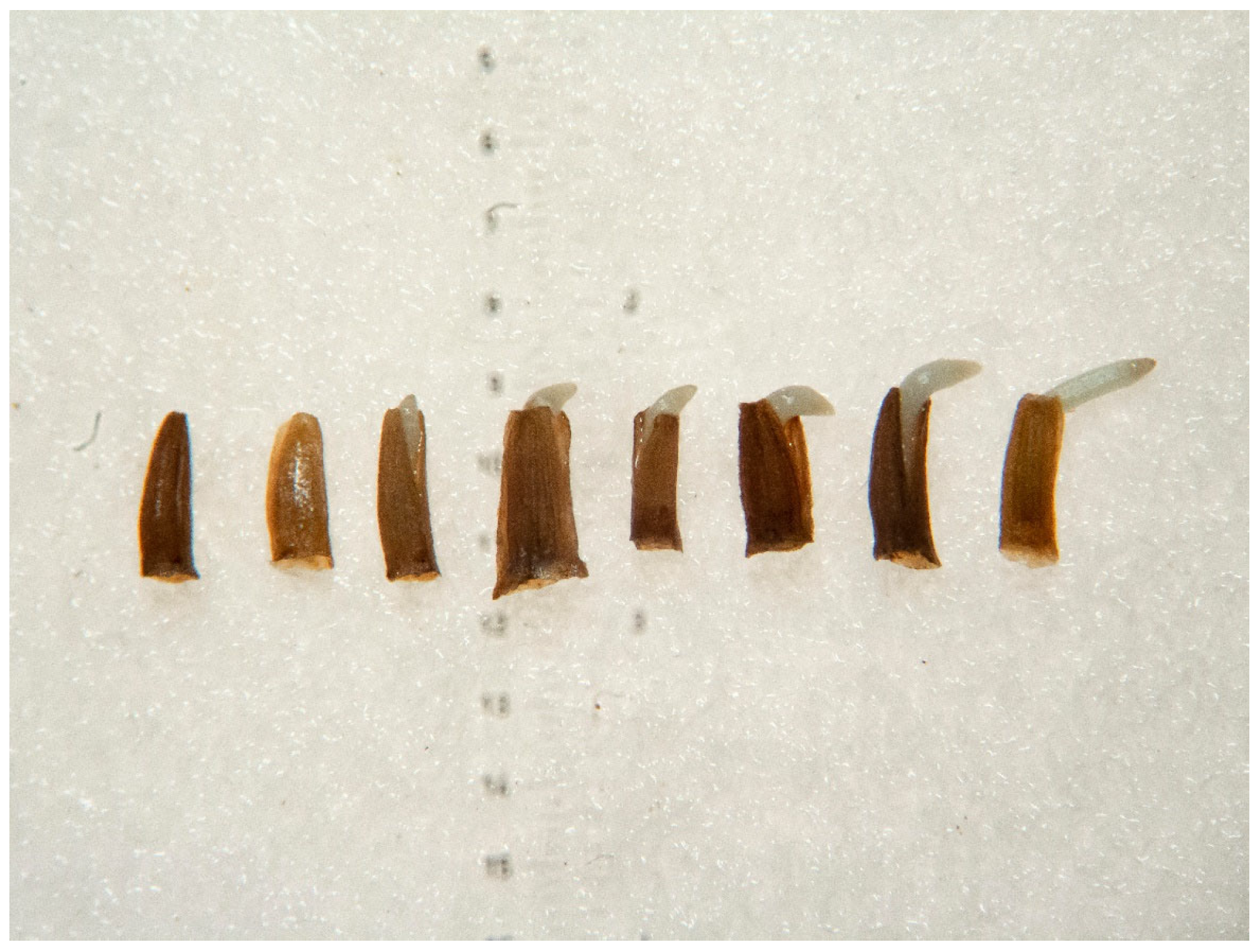 - Maleki, K.; Vandelook, F.; Saatkamp, A.; Maleki, K.; Heshmati, S.; Soltani, E. Global Patterns in the Evolutionary Relations Between Seed Mass and Germination Traits. Ecol. Evol. 2025, 15, e71543. [Google Scholar] [CrossRef] [PubMed]