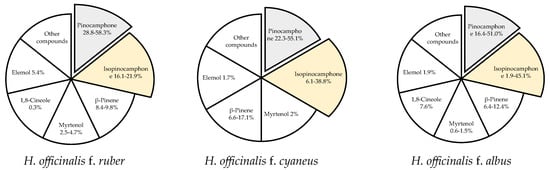 Changes in the chemical composition of the essential oil of H. officinalis may be triggered by many factors, with intraspecific differences being the most significant one. Hyssop contains more than 1% of essential oil, with the highest content recorded at the beginning of the flowering phase. The content and chemical composition of the essential oil also depend on the plant genotype. According to Jankovsky and Landa [13], the content of essential oil in 6 representatives of the phenotype (corolla color from dark blue to white) was determined by the color of the flowers (a higher content was found in individuals with a darker color), whereas stems without leaves and other parts of the plants did not contain essential oil. Likewise, Aćimović et al. [6] analyzed the content and chemical composition of essential oil isolated from white-flowered (f. albus), pink (f. ruber), and purple-blue (f. cyaneus) hyssop and determined from 0.47% (f. albus) to 0.74% (f. cyaneus) of volatile oil. In turn, Mohamadpoor et al. [38] reported smaller differences in the essential oil content in the inflorescences of two Iranian varieties of H. officinalis spp. angustifolius, i.e., 0.40 and 0.45 mL·100 g−1 for white and purple flowers, respectively. Intraspecific variability also applies to the chemical composition of hyssop essential oil (Figure 2).