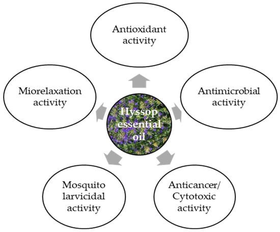 Hyssop essential oil is commonly used in cosmetics, perfumes, alcoholic and non-alcoholic beverages, and food additives. It can also be intended for external use as a fragrance ingredient in soaps, perfumes, creams, and other cosmetic products, as well as in aromatherapy. It is also an ingredient of bath salts, compresses, body oils, and massage oils. There are patented hyssop-based cosmetic preparations: JP 2004262861 of 24 September 2004, which is used against wrinkles, and KR2005073080 of 7 March 2015, which is used to treat acne, specifically against the Propionibacterium acnes bacterium [17]. The yield of hyssop essential oil ranges from 10 to 20 kg·ha−1, and varies greatly depending on the raw material type [15]. Hyssop essential oil can be used as a natural supplement in combating microbiological foodborne diseases, as well as an ingredient in flavorings (herbal, camphor scent with warm and spicy notes), especially in meat products, sauces, soups and spices [12]. Hyssop essential oil can be applied as a natural supplement in combating foodborne diseases of microbiological origin and as a component of flavor combinations (herbal, camphoraceous aroma with warm and spicy notes), especially in meat products, sauces, soups, and seasonings [12]. It exhibits multiple biological activities (Figure 3), depending on its chemical composition, which is in turn affected by the plant’s growth and development conditions and/or the type of raw material subjected to the distillation process.