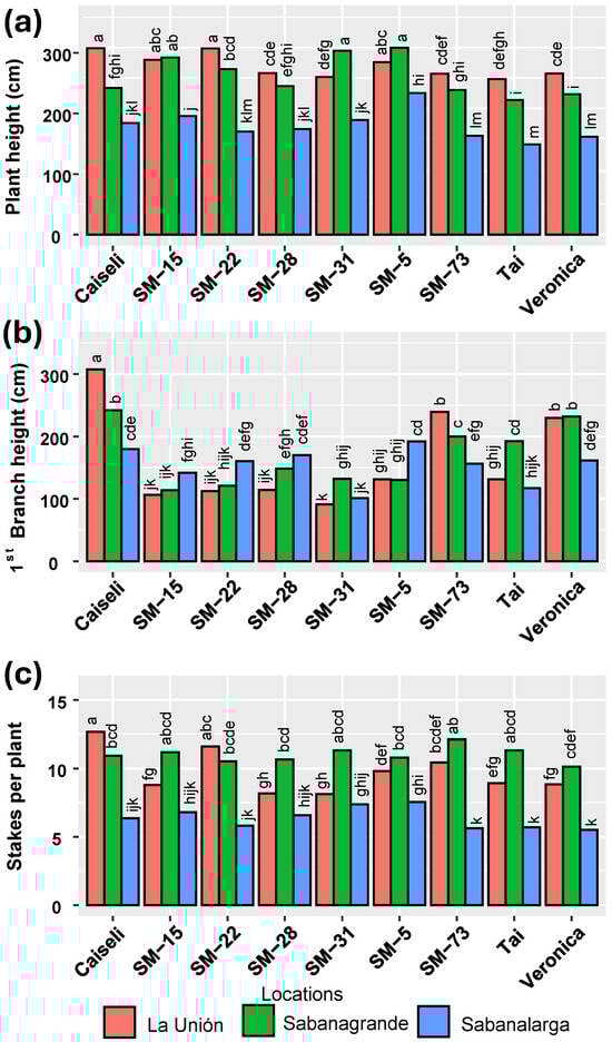 Influence of environment (locations) on plant architecture of the genotypes evaluated. (a) Plant height, (b) First branch height, (c) Number of cuttings per plant. Means followed by a common letter (within each location) are not significantly different according to the Duncan test (α < 0.05).