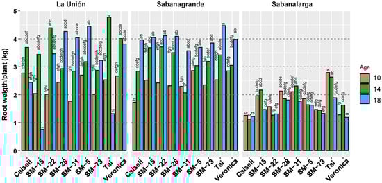 The environmental conditions in La Unión and Sabanagrande (Humid Caribbean subregion) positively influenced root production per plant, resulting in higher yields. In contrast, conditions in Sabanalarga (Dry Caribbean subregion) were unfavorable, leading to the lowest root weight per plant (Figure 5).