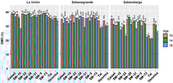 The experimental clone SM-28 showed not only competitive DMC levels compared with the reference variety Caiseli, but also remarkable stability (Figure 6). Differences in DMC between 10 and 14 MAP were not statistically significant. Moreover, DMC values at La Unión and Sabanalarga increased at 14 MAP, suggesting a rapid recovery following the onset of the rainy season. At 18 MAP, DMC varied across locations, reaching its highest level in Sabanagrande and its lowest—significantly so—in La Unión, with a similarly low value in Sabanalarga. Clone SM-31 also displayed high and stable DMC levels, except at 14 MAP in Sabanagrande and 18 MAP in Sabanalarga.