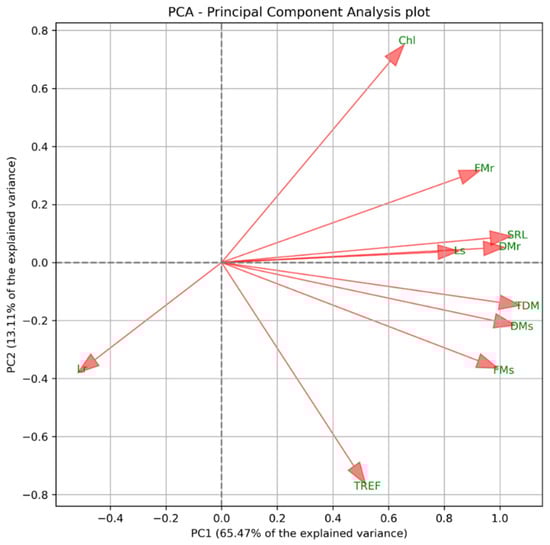 Principal Component Analysis (PCA) biplot showing the distribution of physiological parameters. FMs = fresh mass of the shoot; FMr = fresh mass of the root; DMs = dry mass of the shoot; DMr = dry mass of the root; Ls = shoot length; Lr = root length; TREF = number of trifoliate leaves; SRL = specific root length; TDM = total dry mass; Chl = chlorophyll.