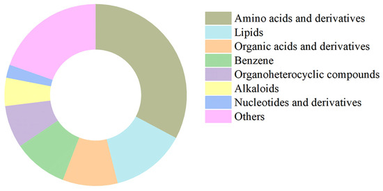 Chemical classification of metabolites identified in purified stabilisomes from the representative Synechococcus sp. The chart displays the classification of 1076 metabolites identified from purified stabilisomes of the representative Synechococcus sp. Percentages represent the proportion of the number of metabolite types within each class relative to the total number of identified types. The results clearly show that amino acids and their derivatives (33%) represent the most diverse category by a significant margin, followed by lipids (13%), organic acids and derivatives (10%), and benzene and substituted derivatives (10%). Data are presented as mean ± SD (n = 3 independent biological replicates).