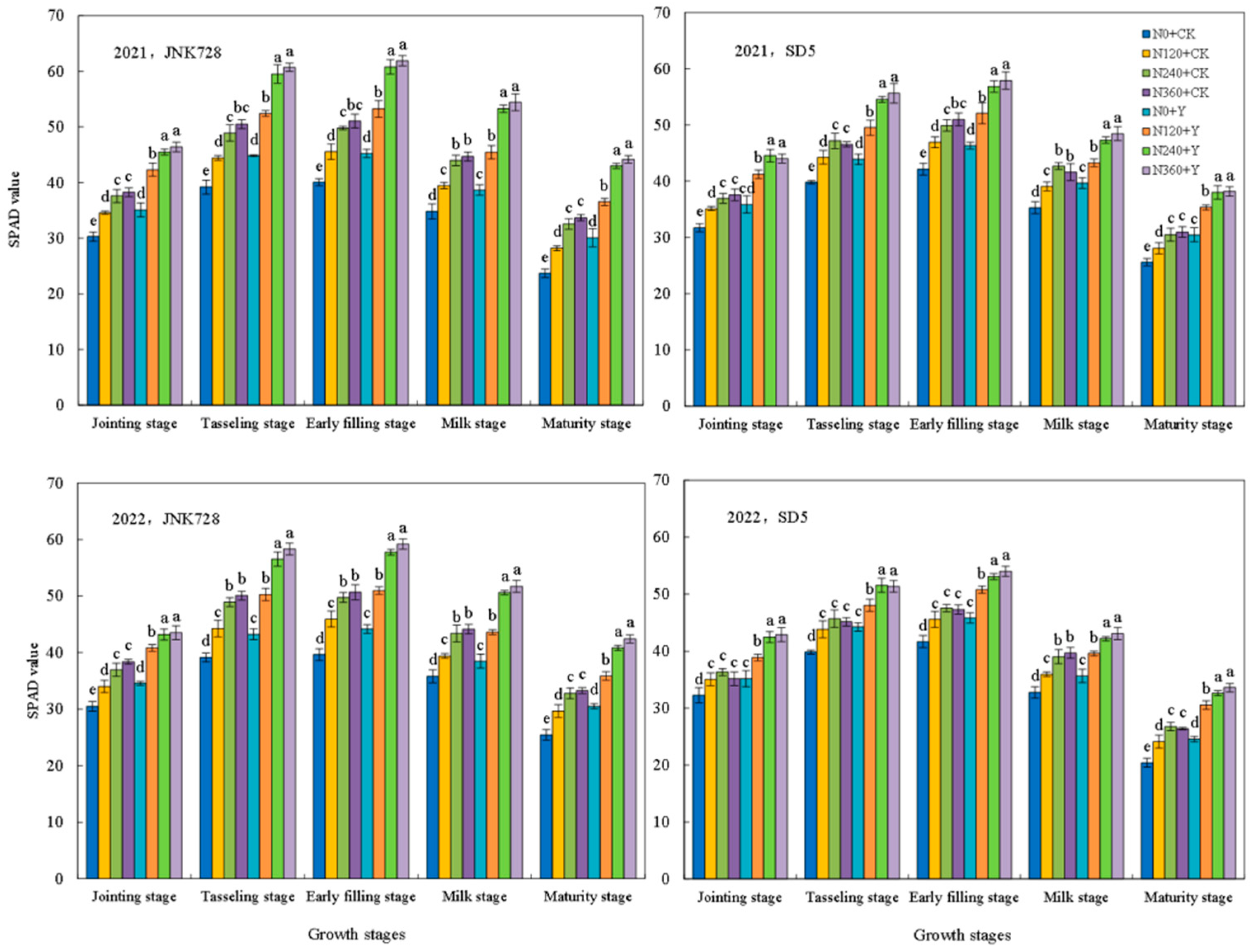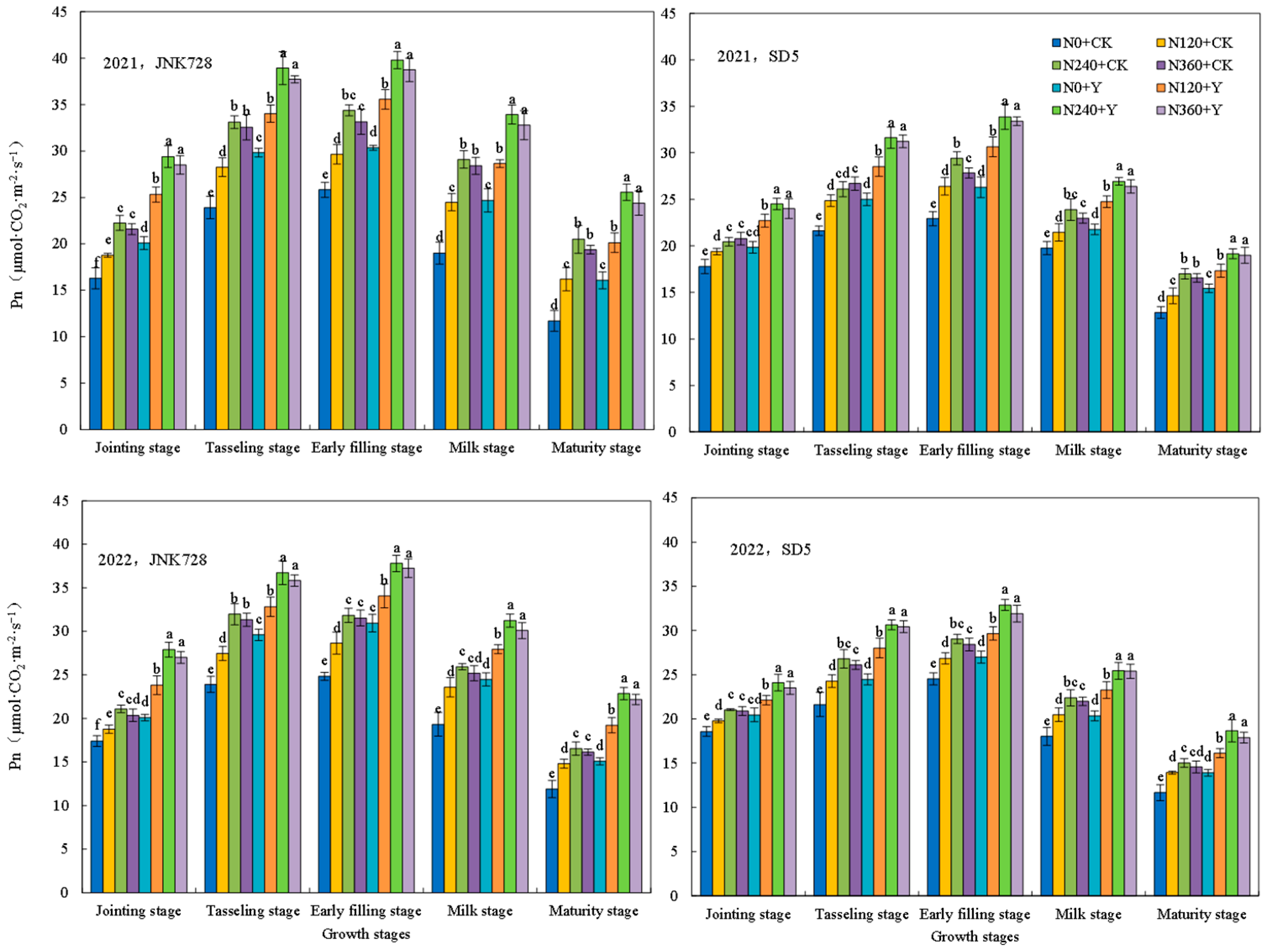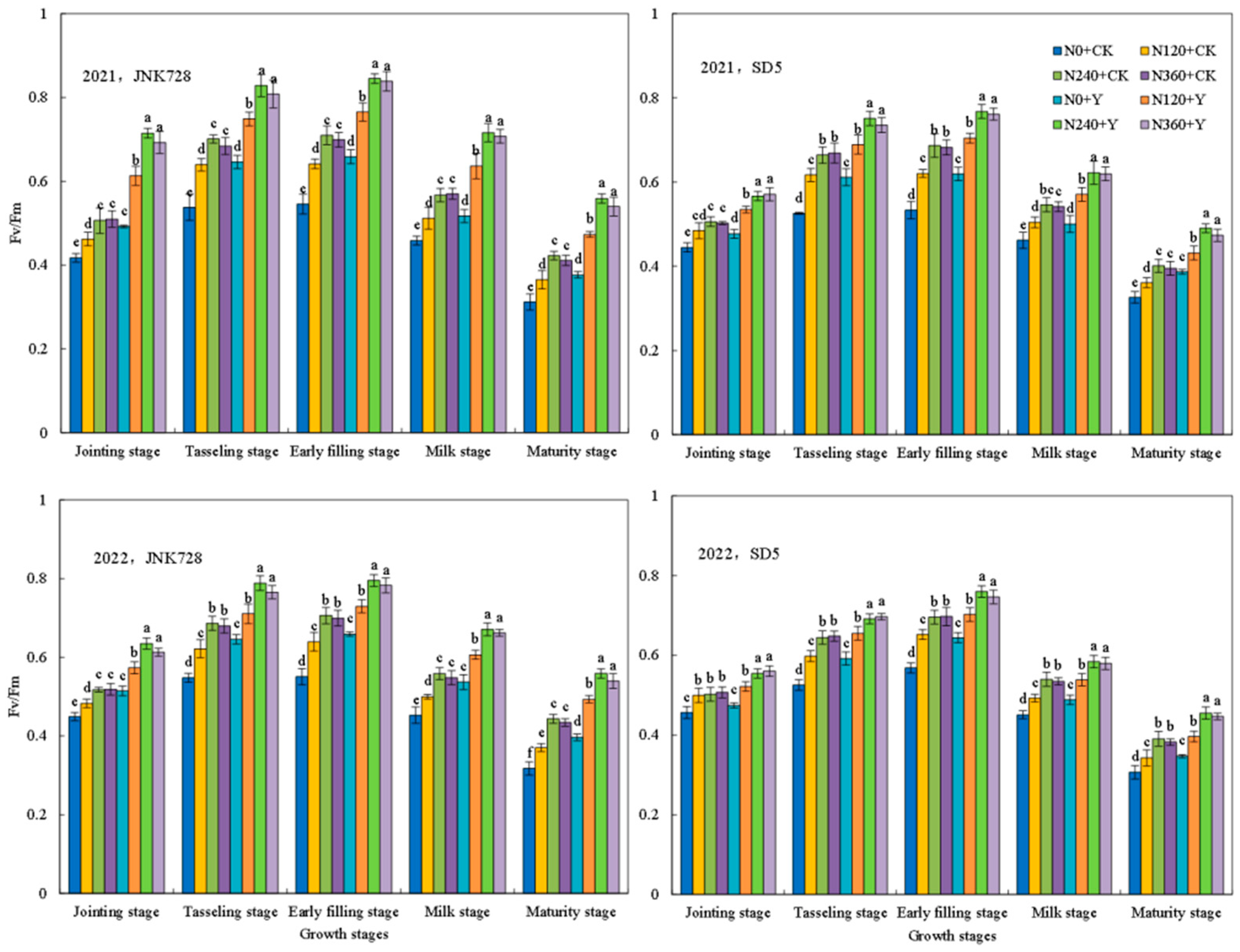 Photosynthetic characteristics are critical determinants of maize yield. The SPAD value, Pn, and Fv/Fm exhibited consistent variation trends across two growing seasons (Figure 1, Figure 2 and Figure 3). All parameters increased from the jointing stage, reached their peak at the early filling stage, and subsequently declined. Nitrogen fertilizer and chemical regulation significantly improved maize photosynthetic performance under high planting density. Compared with 0 kg N ha−1 (N0), the application of 240 kg N ha−1 (N240) significantly enhanced photosynthetic indexes at all growth stages. At the early filling stage, the N240 treatment increased SPAD, Pn, and Fv/Fm by an average of 28.9%, 28.5%, and 26.1% in JNK728, and by 18.0%, 24.3%, and 23.0% in SD5, respectively. However, there are no significant differences between N240 and 360 kg N ha−1 (N360) treatments. Compared with water application (CK), chemical regulation significantly increased SPAD, Pn, and Fv/Fm by 16.3%, 18.6%, and 17.3% in JNK728, and by 11.8%, 14.0%, and 11.1% in SD5, respectively.