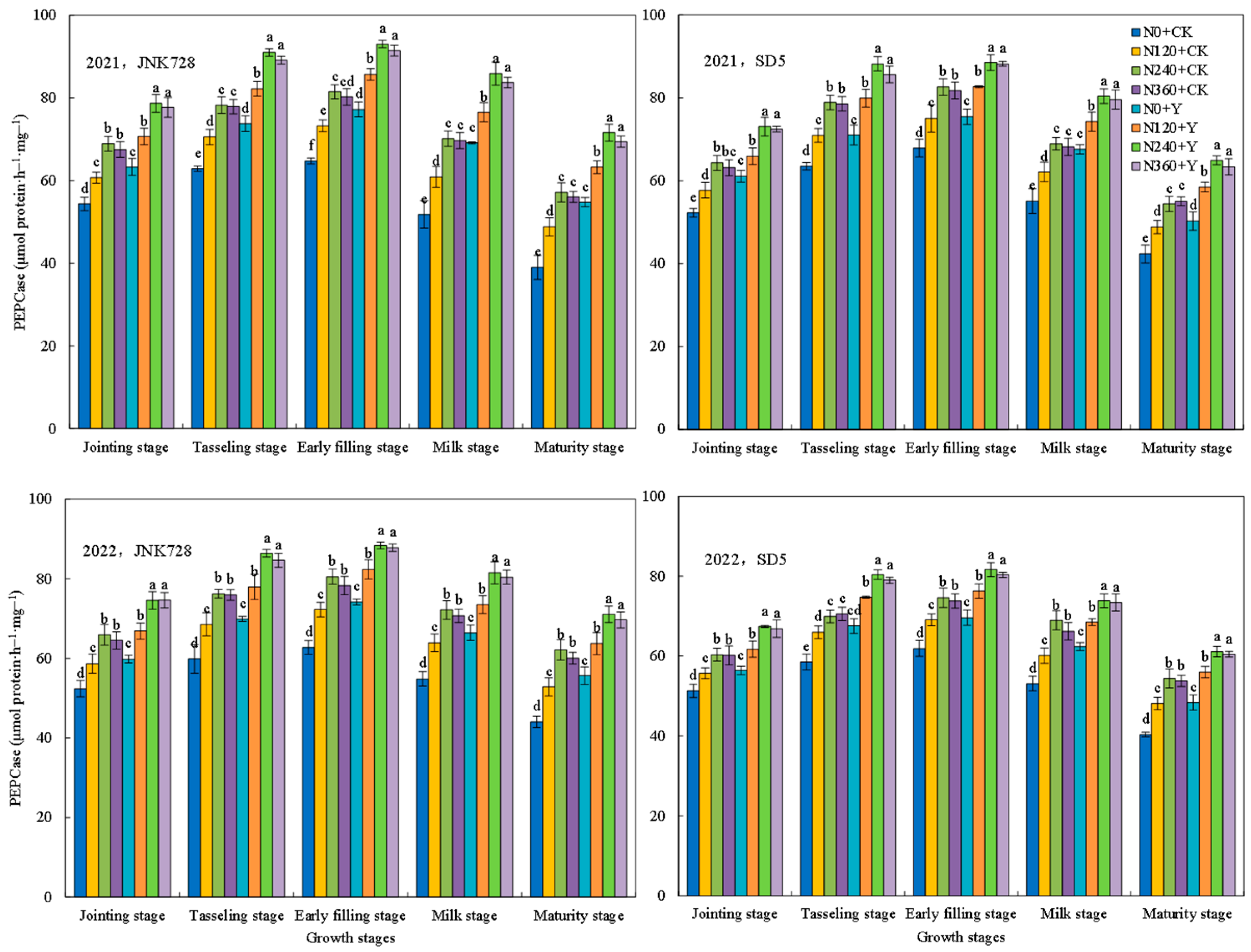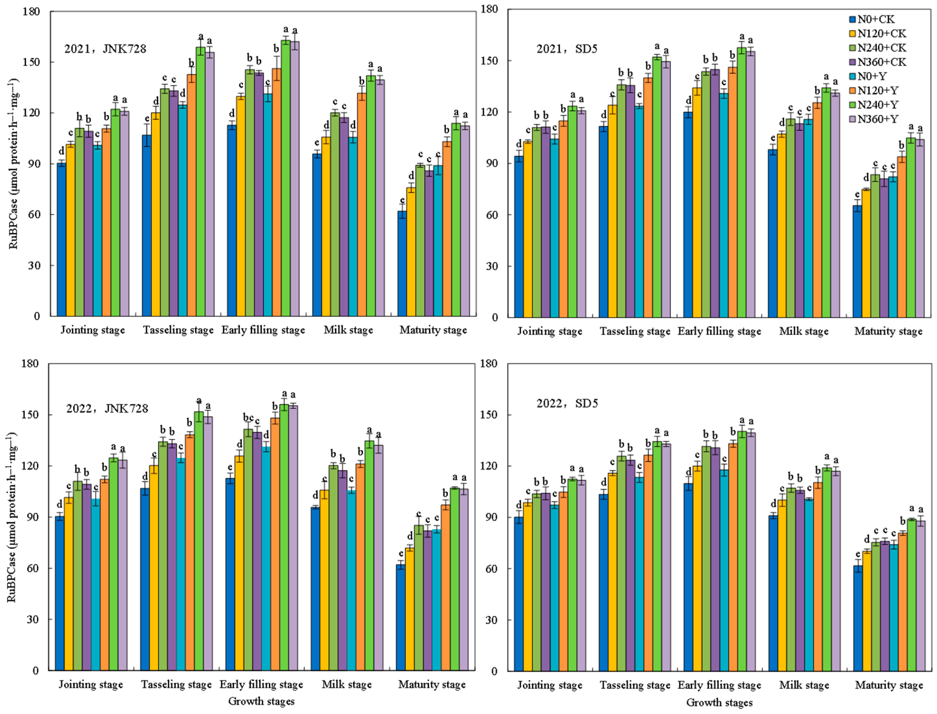RuBPCase and PEPCase are key enzymes in photosynthetic carbon assimilation in maize. The two enzymes’ activities increased consistently from the jointing stages, peaked at the early filling stage, and subsequently declined (Figure 4 and Figure 5). Nitrogen fertilizer significantly increased RuBPCase and PEPCase activities, while no significant difference was observed between the N240 and N360 treatments. Chemical regulation also increased enzyme activities, with RuBPCase and PEPCase activities elevated by 13.5% and 14.6% in JNK728, and 8.3% and 9.5% in SD5, respectively. These results indicate that nitrogen fertilizer and chemical regulation are effective measures for sustaining photosynthetic capacity in high-density maize cropping systems.