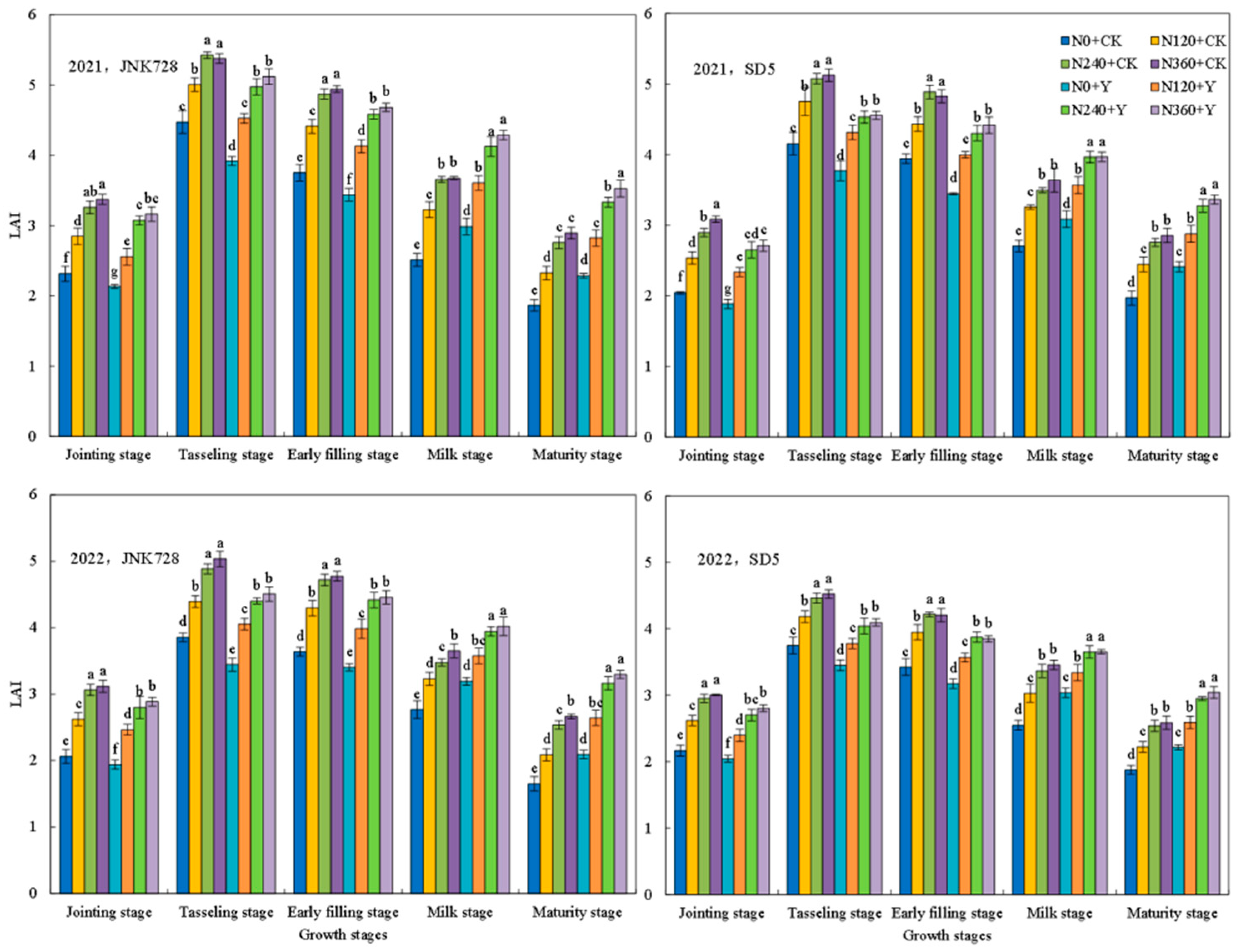 LAI is a key index of canopy structure and photosynthetic area, reflecting light interception and utilization of the population. The LAI increased consistently from the jointing stages, peaked at tasseling, and subsequently declined (Figure 6). Nitrogen application significantly enhanced the LAI at each growth stage, while no significant difference was observed between the N240 and N360 treatments. Chemical regulation significantly reduced the LAI during the jointing stage to the early filling stage, while it increased LAI during the milk stage to the maturity stage.