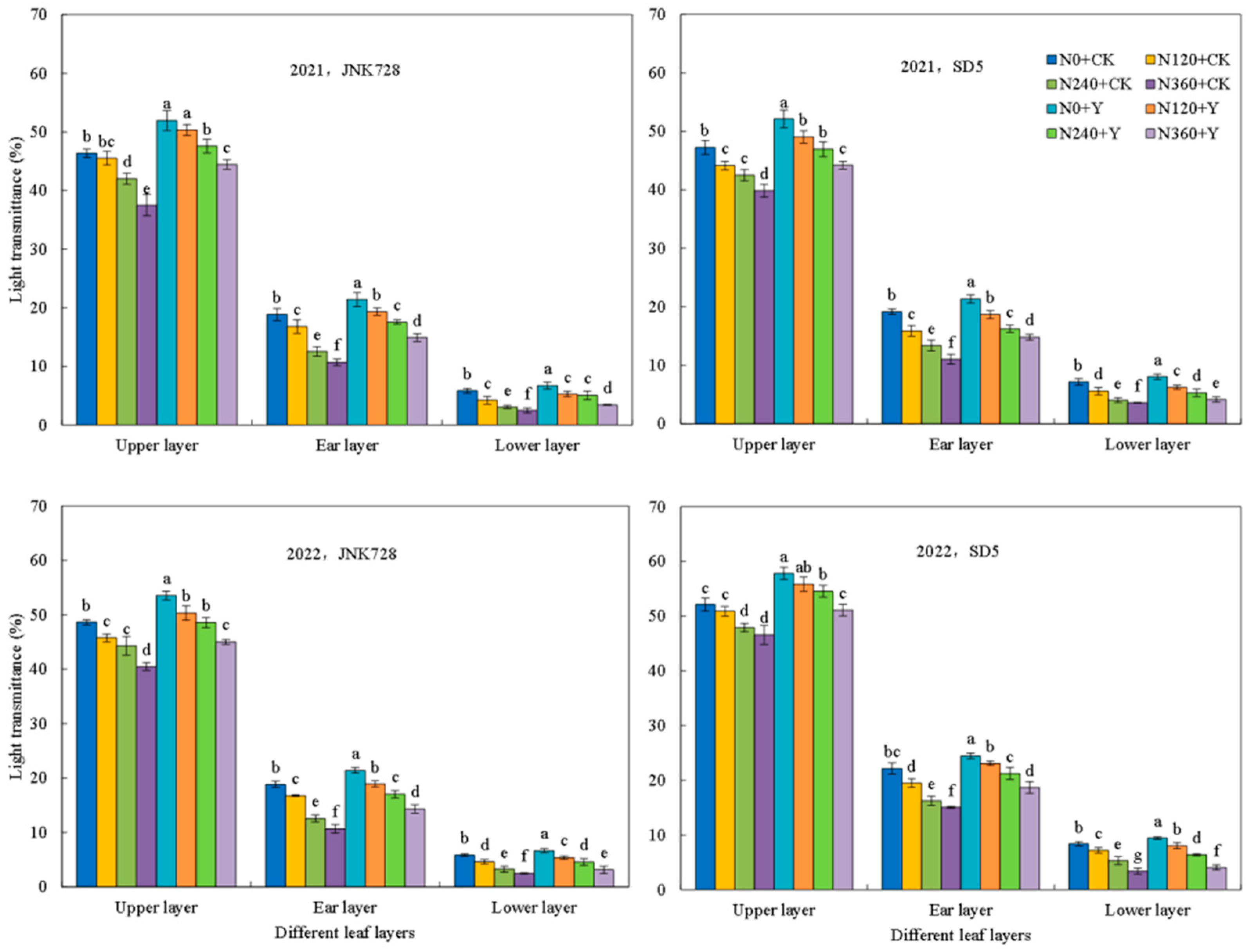 At the early filling stage, light transmittance within the canopy followed the pattern: upper layer > ear layer > lower layer (Figure 7). Nitrogen application significantly reduced light transmittance across all canopy layers. Chemical regulation significantly increased light transmittance for JNK728 and SD5, with corresponding increases of 11.8% and 10.9% in the upper layer, 23.1% and 19.7% in the ear layer, and 26.7% and 15.8% in the lower layer, respectively. Thus, the nitrogen fertilizer and chemical regulation improved canopy light transmittance and optimized population photosynthetic performance.
