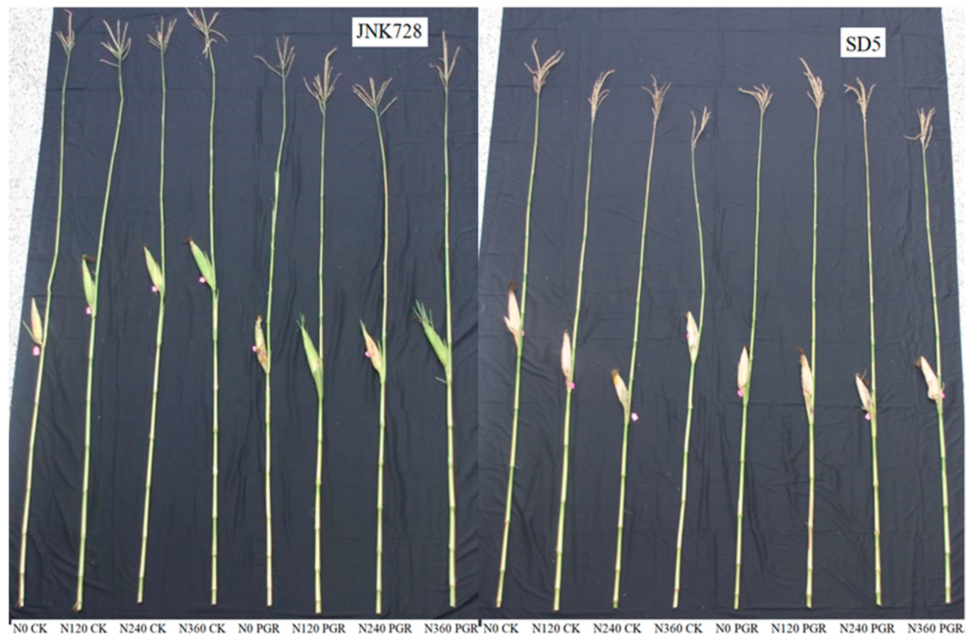 Nitrogen fertilizer serves as a significant measure for mitigating the detrimental effects induced by high planting density. Rational nitrogen supply enhances maize photosynthesis, thereby increasing the accumulation of assimilates and improving grain yield [15]. Studies indicate that optimal nitrogen rates can significantly enhance grain yield and dry matter accumulation under high planting density [16]. However, excessive nitrogen application promotes overly vigorous leaf growth, which deteriorates light conditions within the canopy and is detrimental to biomass and yield formation [4]. Consequently, under high planting density, merely relying on nitrogen fertilizer may fail to raise yields. Moreover, it can exacerbate excessive vegetative growth, increase lodging risk, and aggravate fertilizer waste [17]. Chemical regulation is an effective strategy for reducing lodging risk in maize production. Plant growth regulators (PGRs) can inhibit internode elongation by modulating endogenous hormone levels, thereby enhancing lodging resistance [18]. Studies have shown that PGRs effectively reduced plant height and ear height, increased stem diameter, and consequently improved lodging resistance [19]. Furthermore, chemical regulation is effective in modulating maize canopy architecture. Studies have shown that it can adjust leaf size and spatial distribution, thereby improving canopy structure and internal light conditions, which creates a more favorable environment for photosynthesis [20]. The plant growth regulator used in this study was 30% diethyl aminoethyl hexanoate · ethephon. Diethyl aminoethyl hexanoate could improve photosynthetic capacity in leaves and increase maize yield, while ethephon could reduce internode length, enhance cellulose and lignin content in internodes, and strengthen stem lodging resistance. However, improper management of chemical regulation may lead to excessive suppression of vegetative growth, which can compromise photosynthetic capacity and consequently reduce grain yield [21]. Hence, achieving an optimal balance between lodging resistance and high yield under high planting density is of significant importance in agricultural production. While current research has predominantly centered on the separate impacts of either nitrogen fertilizer or chemical regulation on maize production, the synergistic role of combined nitrogen management and chemical regulation in reconciling the conflict between lodging resistance and high yield under high planting density remains unclear. Therefore, elucidating the regulating mechanisms of nitrogen and chemical regulation on maize growth is crucial for advancing high-yield, high-efficiency, and lodging-resistant maize cultivation.