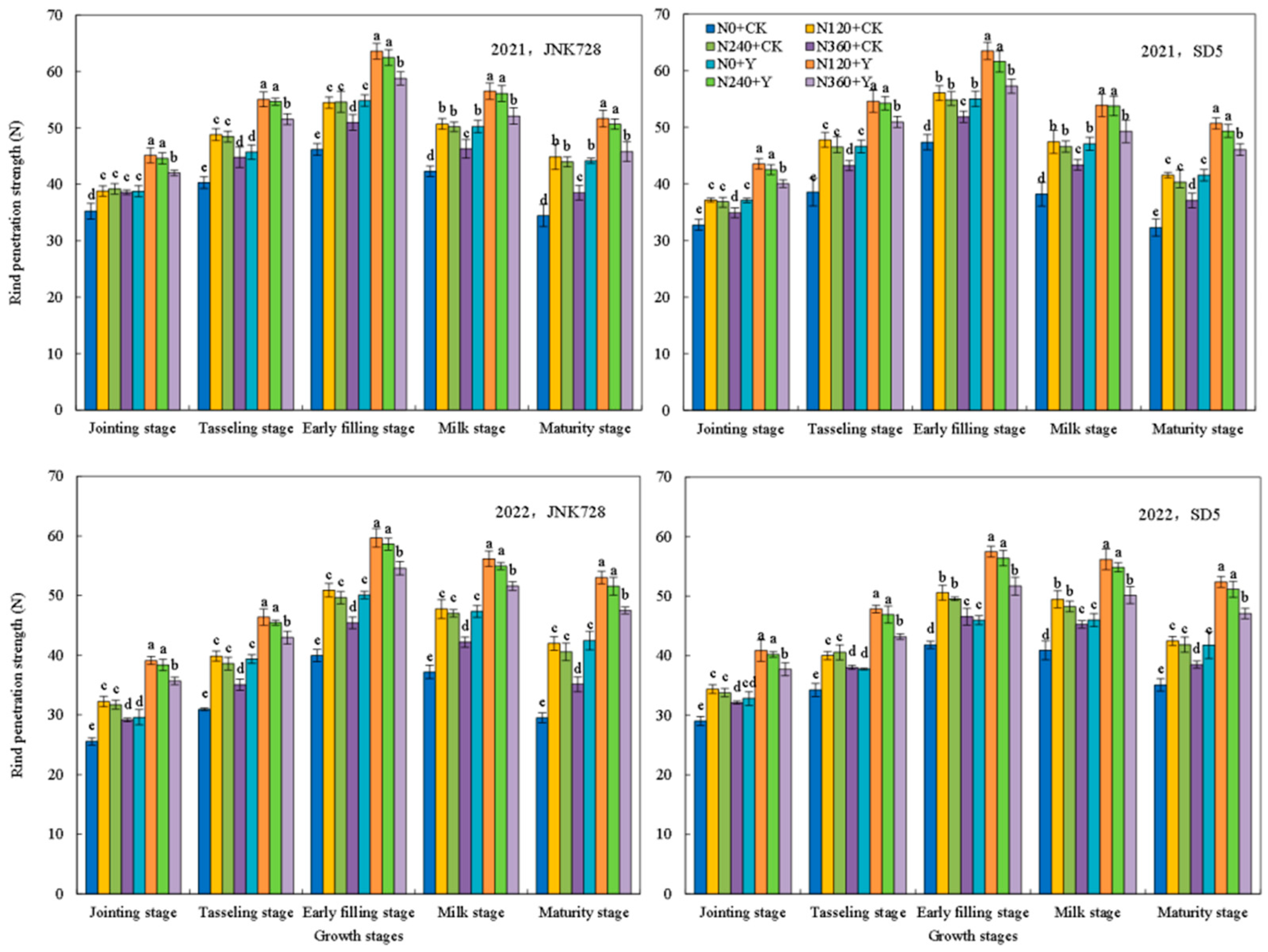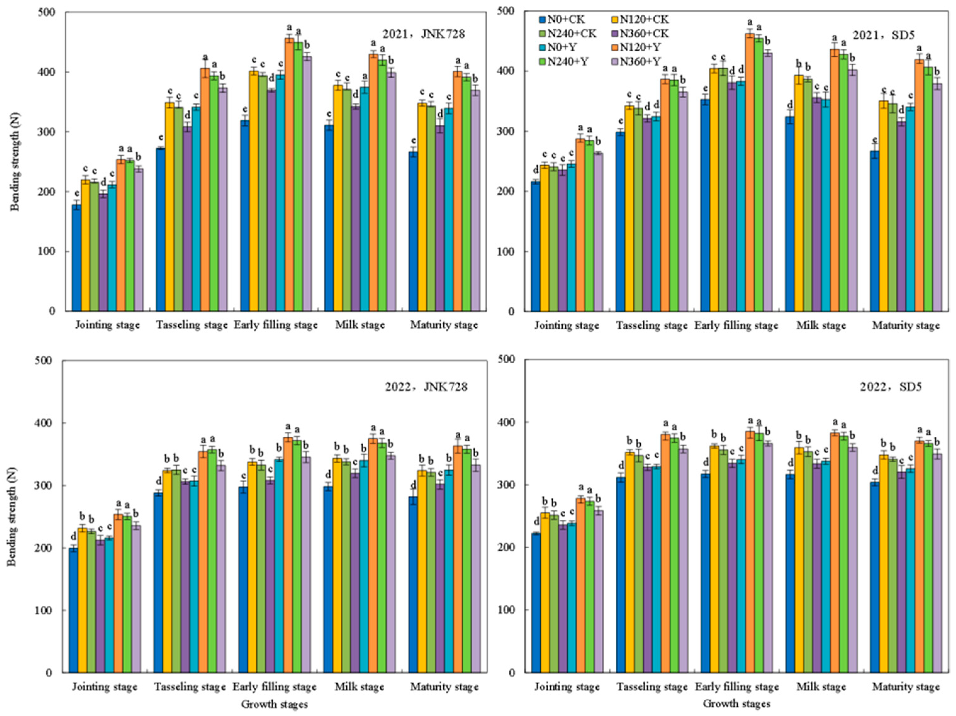 The bending strength and rind penetration strength of the third basal internode are key indicators of stem mechanical strength. During the maize growth period, two parameters initially increased, peaked at the early filling stage (Figure 9 and Figure 10), and subsequently decreased. Bending strength increased initially and then declined with increasing nitrogen application rate. At the early filling stage, compared with N0, the bending strength increased under N120, N240, and N360 treatments by 16.0%, 14.5%, and 7.7%, respectively. A similar trend was observed for rind penetration strength. Consequently, the N120 and N240 treatments resulted in higher bending strength and rind penetration strength, whereas an excessive nitrogen application (N360) led to decreases. Chemical regulation further enhanced these mechanical characteristics. Compared with CK, chemical regulation increased the bending strength and rind penetration strength by 14.6% and 10.0% for JNK728, and by 18.0% and 12.6% for SD5, respectively, at the early filling stage. In conclusion, appropriate nitrogen fertilization combined with chemical regulation significantly enhanced stem mechanical strength under high planting density.