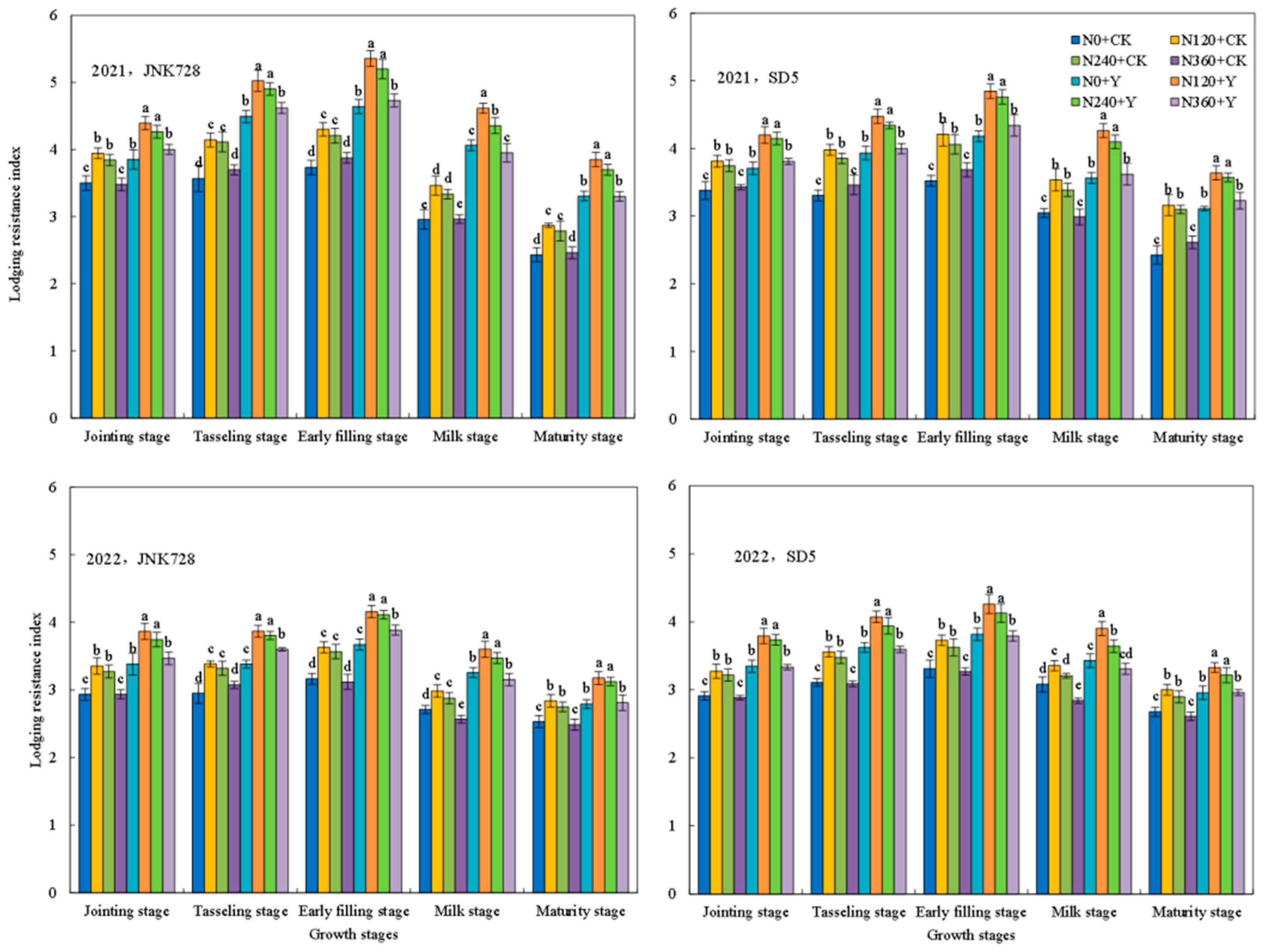During the maize growing season, the stem lodging resistance index initially increased, reached a maximum at the early filling stage, and subsequently decreased (Figure 11). Nitrogen fertilizer and chemical regulation significantly affected the lodging resistance index of maize under high planting density. With the nitrogen rate increased, the lodging resistance index first increased and then decreased. Specifically, the lodging resistance indices were relatively high under the nitrogen application rates of N120 and N240, while an excessively high nitrogen application (N360) conversely led to a decrease in the lodging resistance index. Chemical regulation could enhance the lodging resistance index. Compared with CK, the lodging resistance indices of JNK728 and SD5 increased by 20.8% and 16.0%, respectively, at the early filling stage. This indicated that appropriate nitrogen application and chemical regulation can improve the lodging resistance of maize under high planting density.