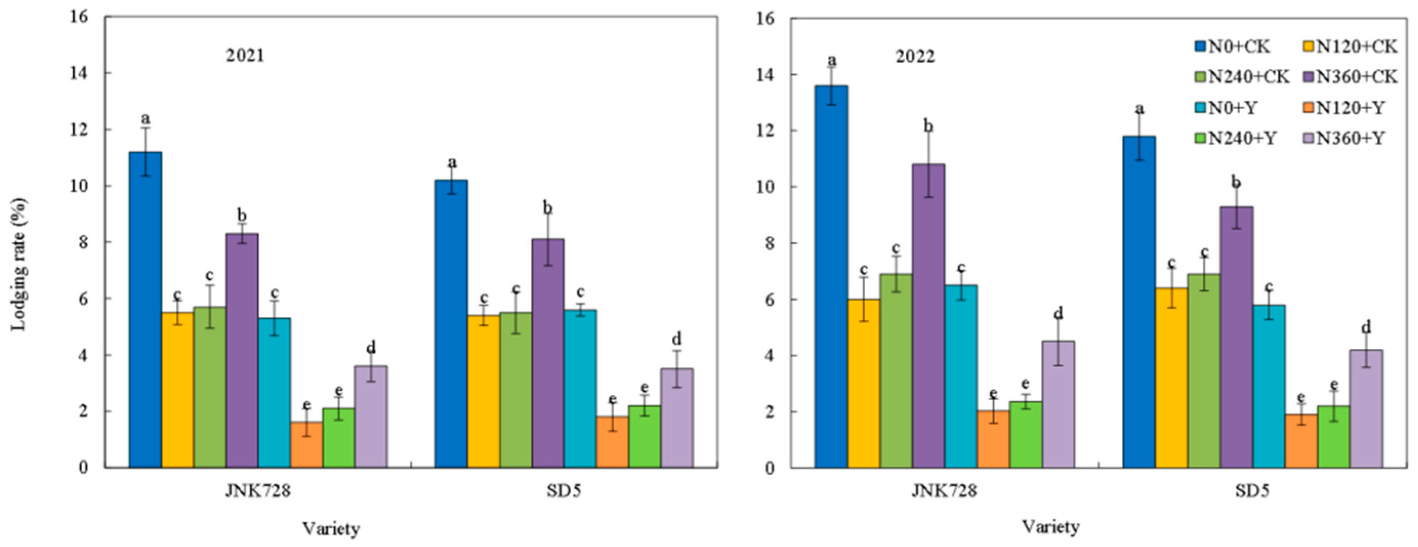 Nitrogen fertilizer and chemical regulation significantly affected the lodging rate of maize at the maturity stage under high planting density (Figure 12). With the increase in nitrogen application rate, the lodging rate first decreased and then increased. Specifically, the lodging rates under the N120 and N240 treatments were relatively low, showing reductions of 50.2% and 46.6%, respectively, compared to the N0 treatment. Chemical regulation could further reduce the lodging rate under different nitrogen application levels. This indicated that appropriate nitrogen fertilizer and chemical regulation can significantly reduce the lodging rate under high planting density.