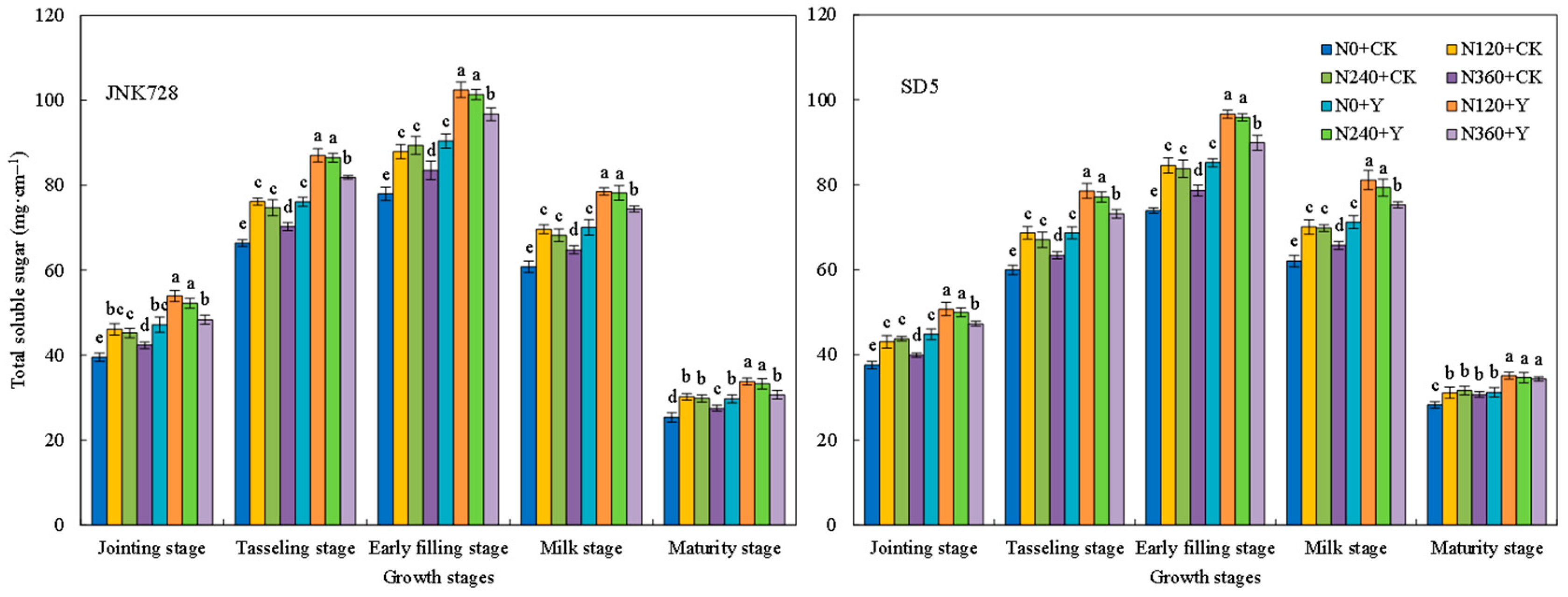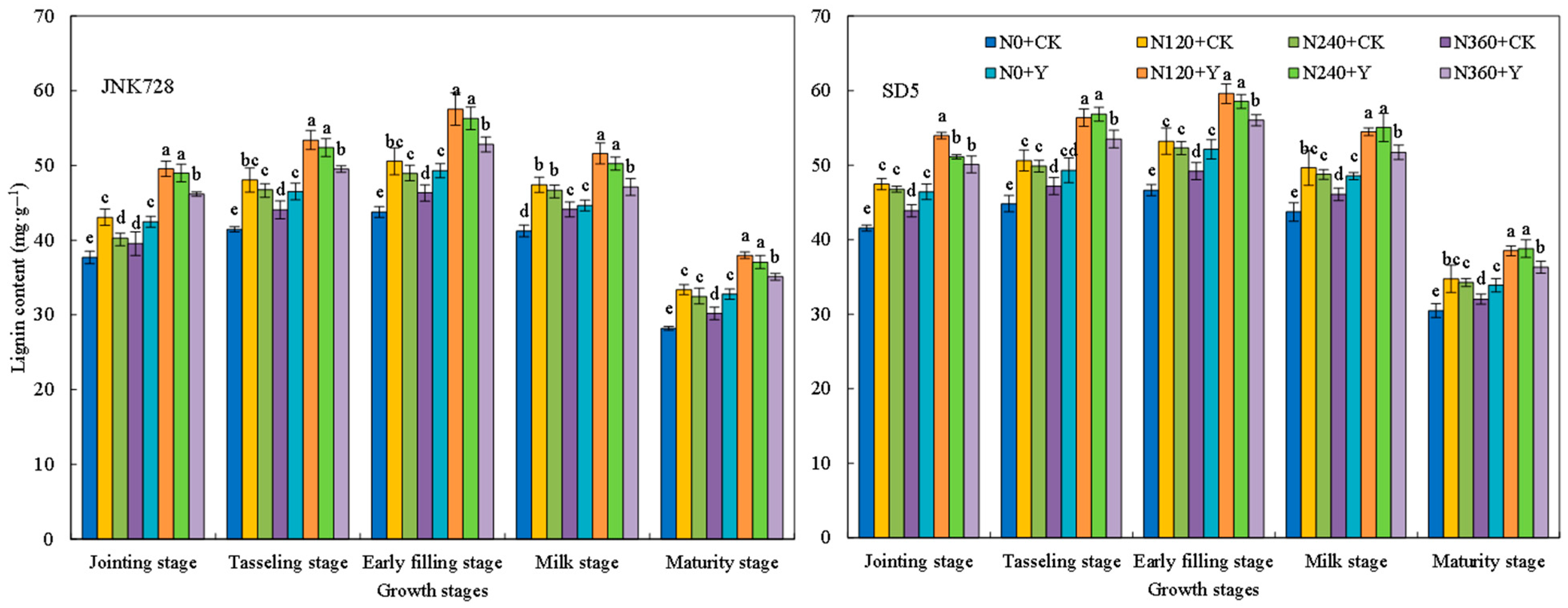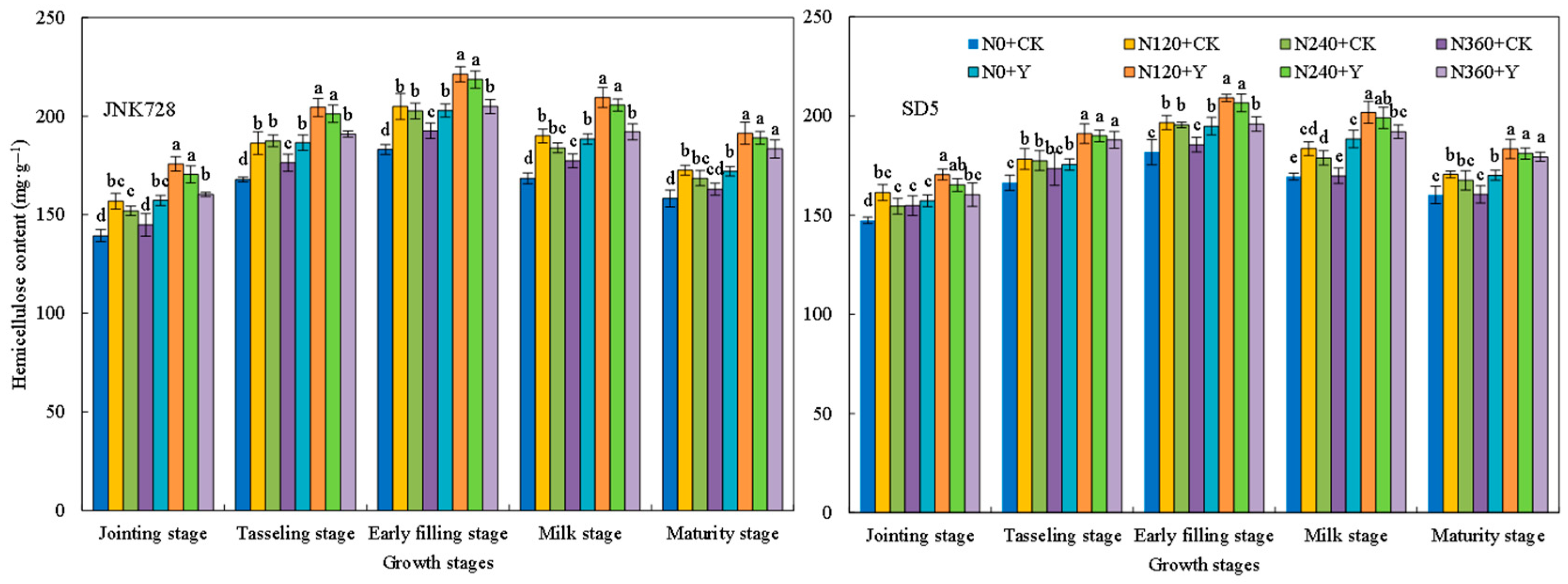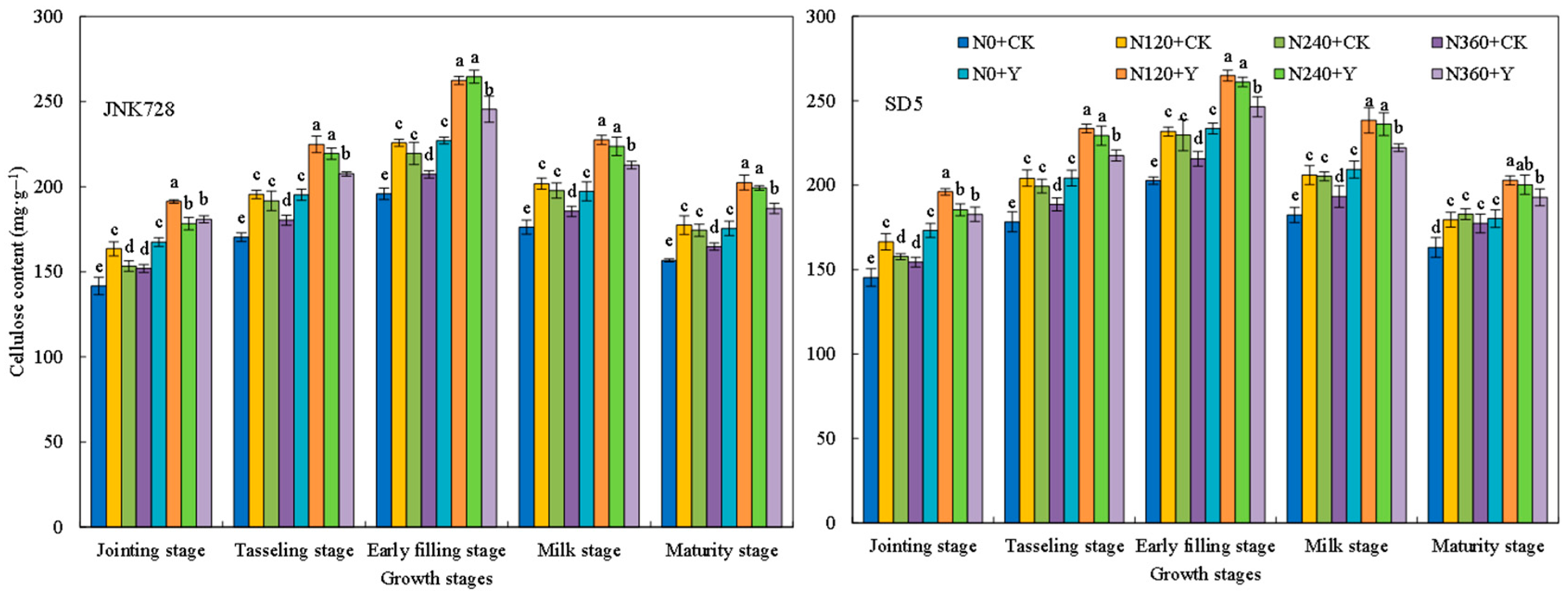 Soluble sugars, cellulose, hemicellulose, and lignin are important storage substances that affect the mechanical strength of the stem. During the growth period, the storage substances in the internodes first increased and then decreased, reaching a peak at the early filling stage (Figure 13, Figure 14, Figure 15 and Figure 16). With the increase in nitrogen rate, the contents of soluble sugars, cellulose, hemicellulose, and lignin in internodes first increased and then decreased. Specifically, the storage substances contents in internodes were relatively high under the N120 and N240 treatments, while an excessively high nitrogen application rate (N360 treatment) led to a decrease in these contents. Chemical regulation could further increase the contents of soluble sugars, cellulose, hemicellulose, and lignin in internodes by 15.0%, 16.1%, 7.2%, 13.9%, and 13.2%, respectively, compared with CK (with the early filling stage taken as an example). This indicated that appropriate nitrogen fertilizer and chemical regulation can significantly increase the content of storage substances in internodes under high planting density.