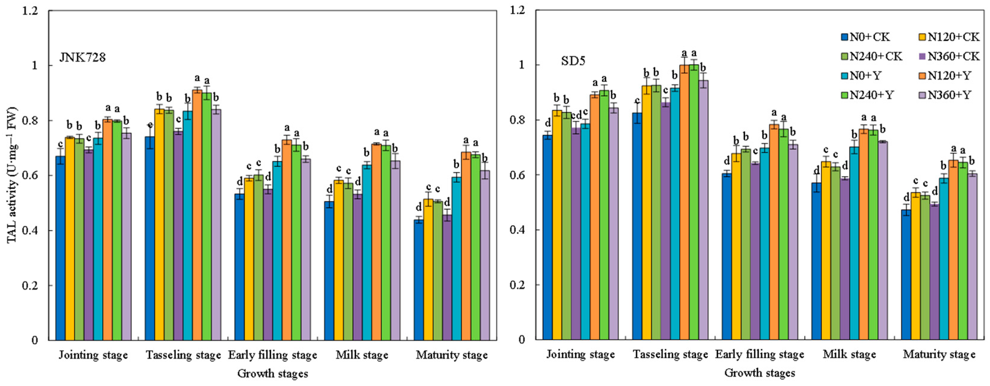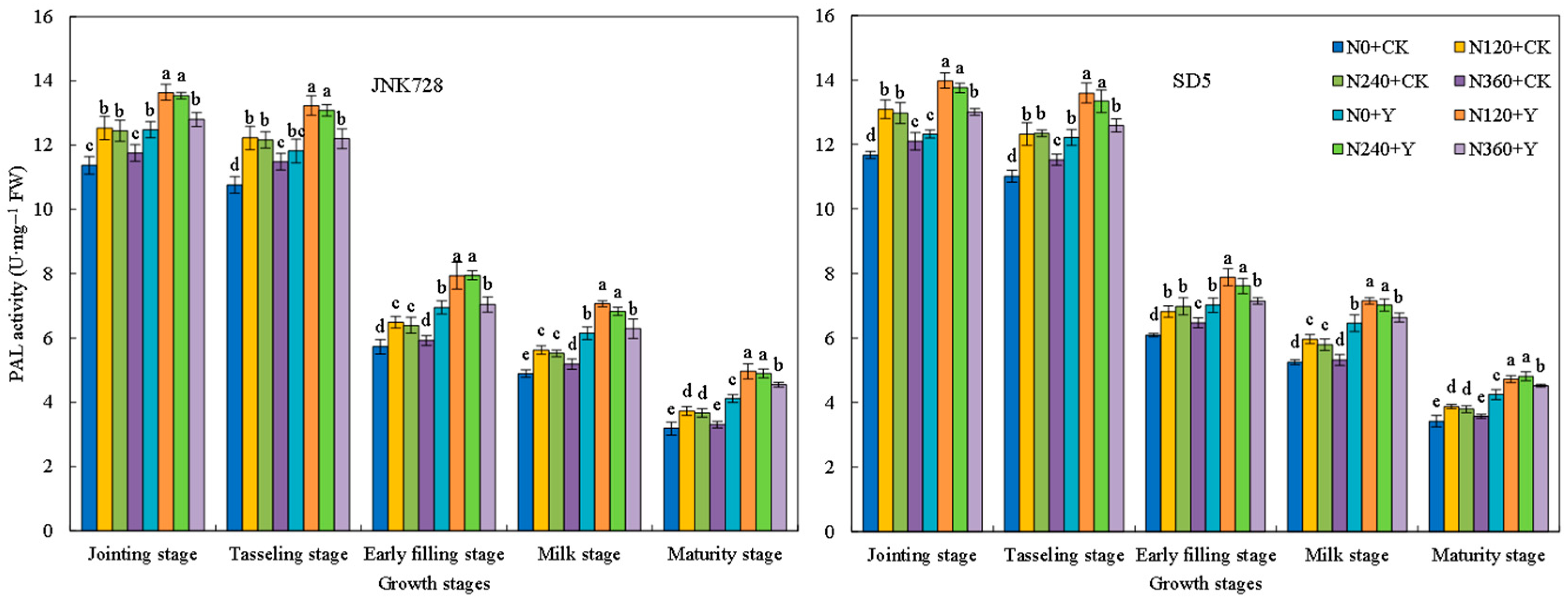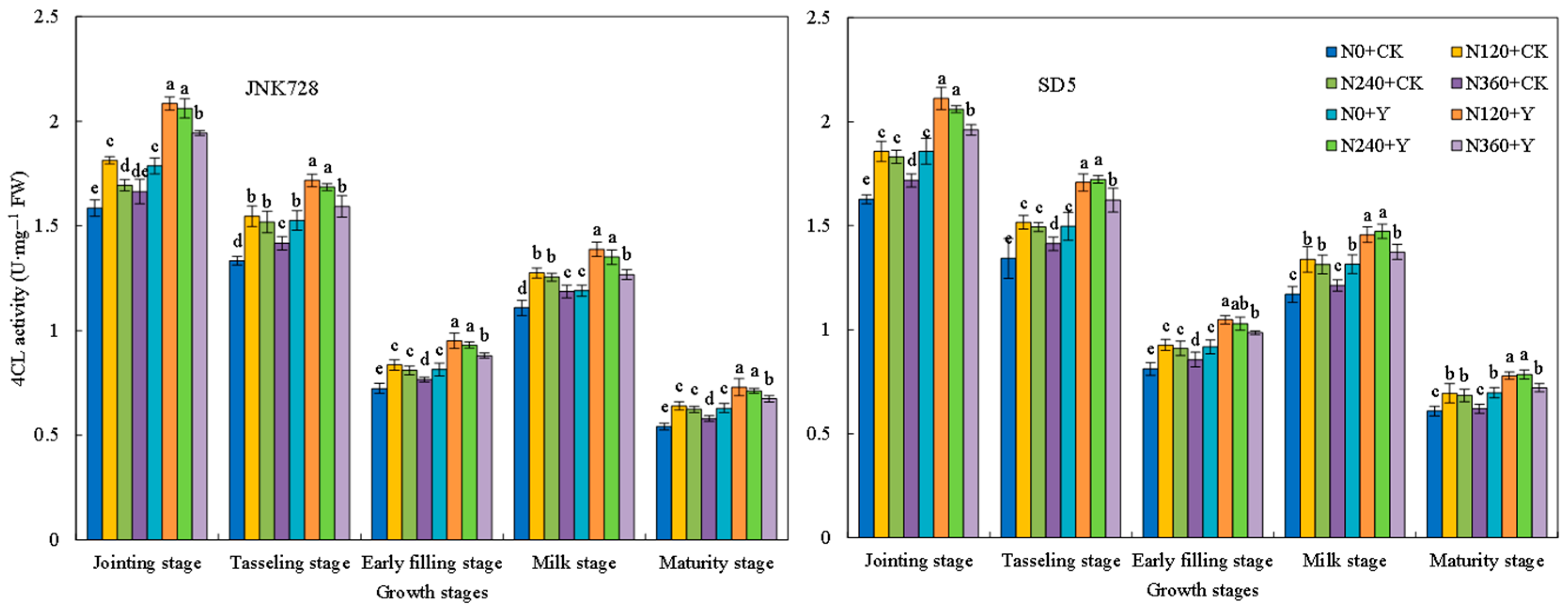 Phenylalanine ammonia-lyase (PAL) activity exhibited a decreasing trend during growth, with high activity from the jointing to tasseling stages (Figure 17). Tyrosine ammonia-lyase (TAL) activity followed a single-peak curve, peaking at the tasseling stage (Figure 18). Cinnamyl alcohol dehydrogenase (CAD) activity first increased and then decreased, reaching its maximum at the early filling stage (Figure 19). 4-coumarate:CoA ligase (4CL) activity generally decreased, with a slight increase at the milk stage (Figure 20). Nitrogen application (N120–N240) enhanced the activities of these four enzymes but inhibited them at excessive rates (N360) under high planting density. Additionally, chemical regulation improved the activities of all four enzymes across growth stages. Correlation analysis revealed that the internode lignin content was significantly positively correlated with the activities of lignin biosynthesis-related enzymes. Therefore, the increase in lignin-related enzymes activities contribute to higher lignin content. These results indicated that appropriate nitrogen application combined with chemical regulation can effectively enhance the activities of key enzymes involved in lignin synthesis in the third basal internode of maize under high planting density, thereby promoting lignin accumulation.