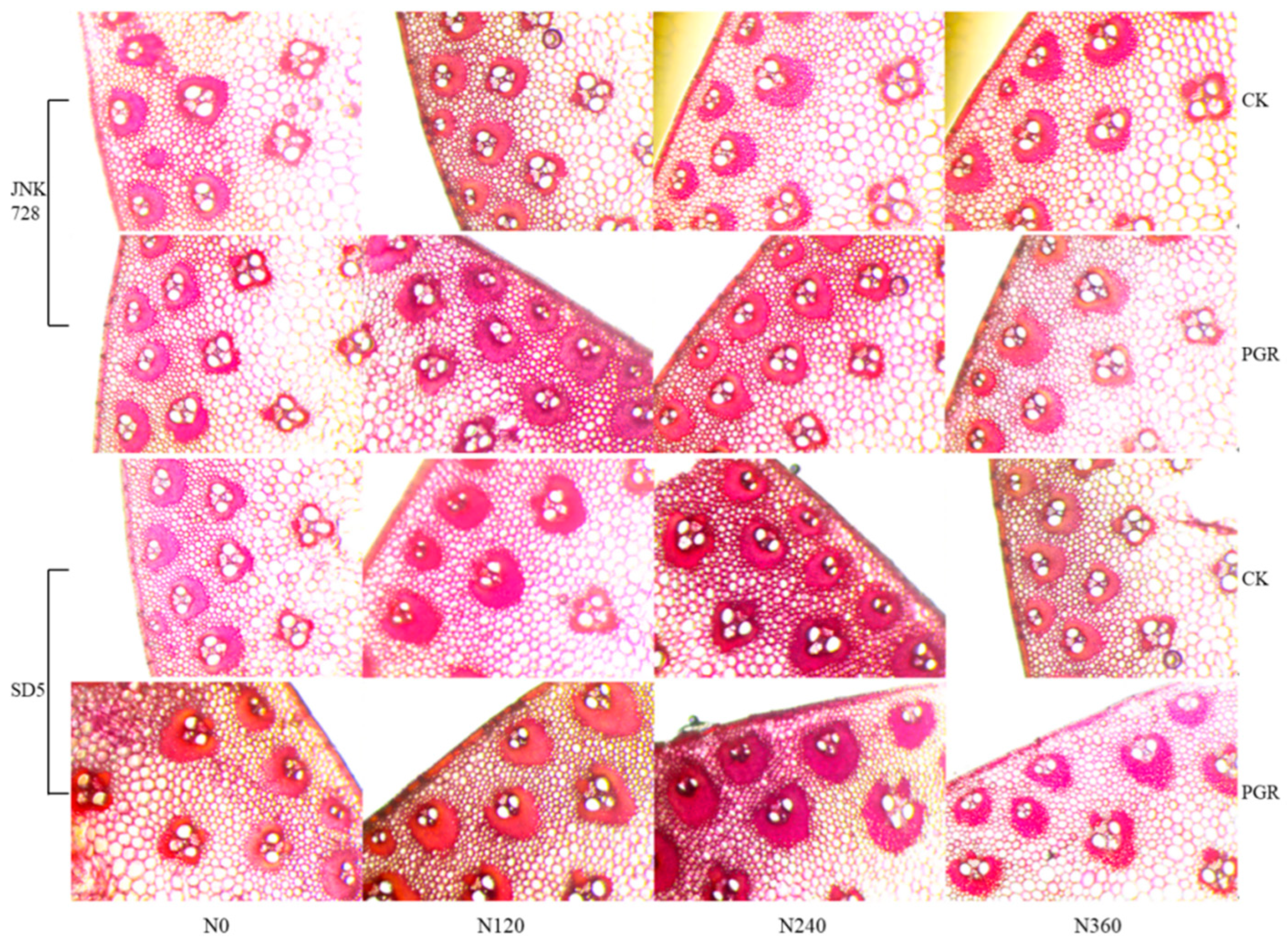 Nitrogen fertilizer and chemical regulation significantly affected stem anatomical structure at the early filling stage under high planting density. With increasing N rate, cortex thickness, mechanical thickness, mechanical cell layers, and large/small vascular bundles number first increased and then decreased, peaking at N120 and N240, while excessive N (N360) significantly reduced these indices (Table 4). Compared to N0, cortex thickness increased by 21.0%, 17.9%, and 10.7% under N120, N240, and N360, respectively; mechanical thickness by 24.1%, 21.1%, and 12.2%; and mechanical cell layers by 25.5%, 22.6%, and 13.1%. Large/small vascular bundle area increased with N application but decreased under N360. Chemical regulation could increase cortex thickness, mechanical thickness, mechanical cell layers, and large/small vascular bundle number/area by 23.6%, 17.2%, 17.9%, and 8.1%/16.9%, 13.7%/17.2%, respectively, compared to CK. These results indicated that appropriate N application combined with chemical regulation optimized the stem anatomical structure of maize under high planting density, thereby enhancing stem mechanical strength and lodging resistance.