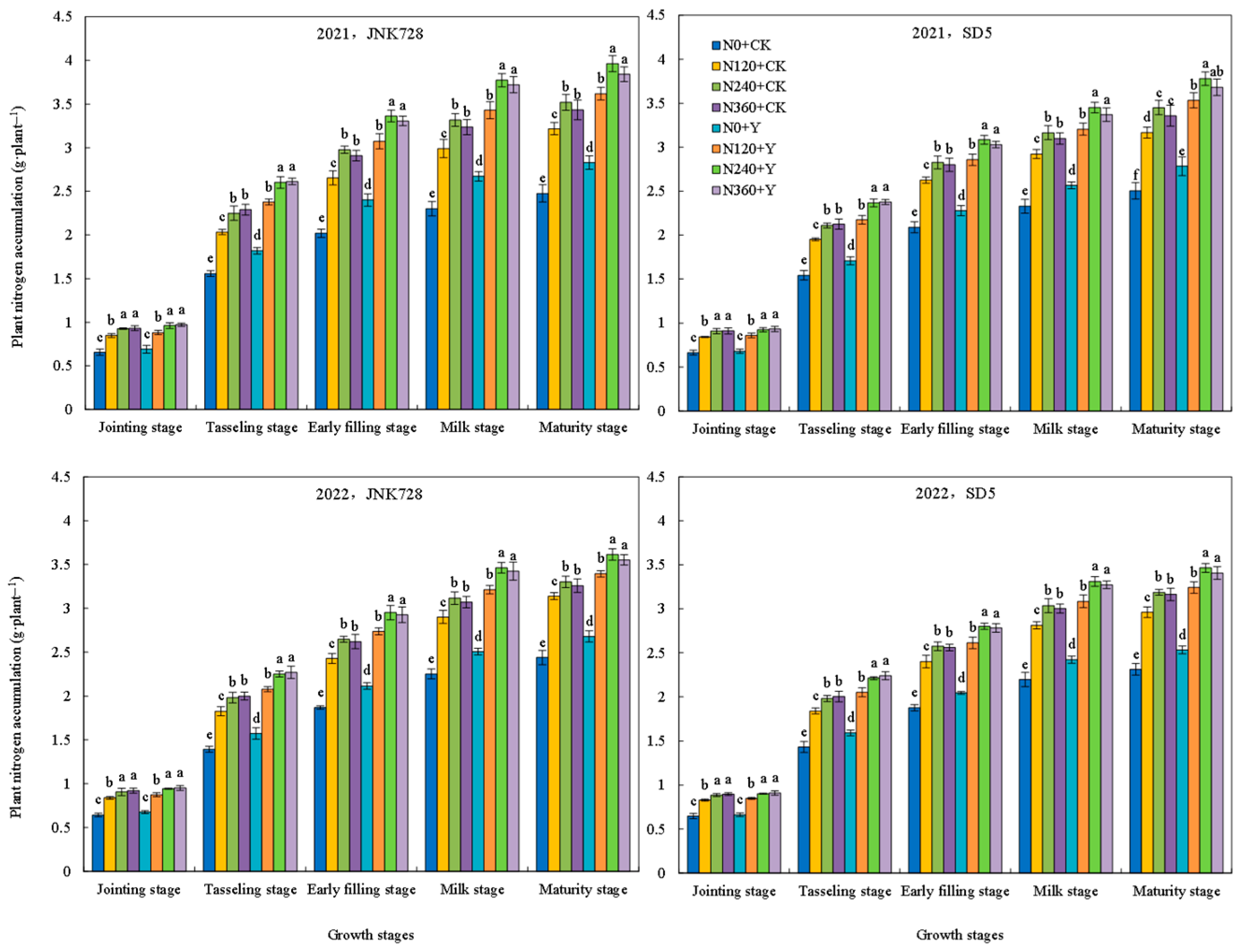 The nitrogen accumulation in plants consistently increased throughout the growth period (Figure 22). It rose rapidly from the jointing stage to the milk stage, then slowed down gradually, reaching the maximum at the maturity stage. Nitrogen application notably enhanced nitrogen accumulation at all growth stages, with no significant difference between N240 and N360. Chemical regulation significantly improved plant nitrogen accumulation in maize throughout the growth period over two years. These results indicated that nitrogen fertilizer and chemical regulation promoted plant nitrogen accumulation under high planting density, maintaining sufficient nitrogen supply during the growth period.