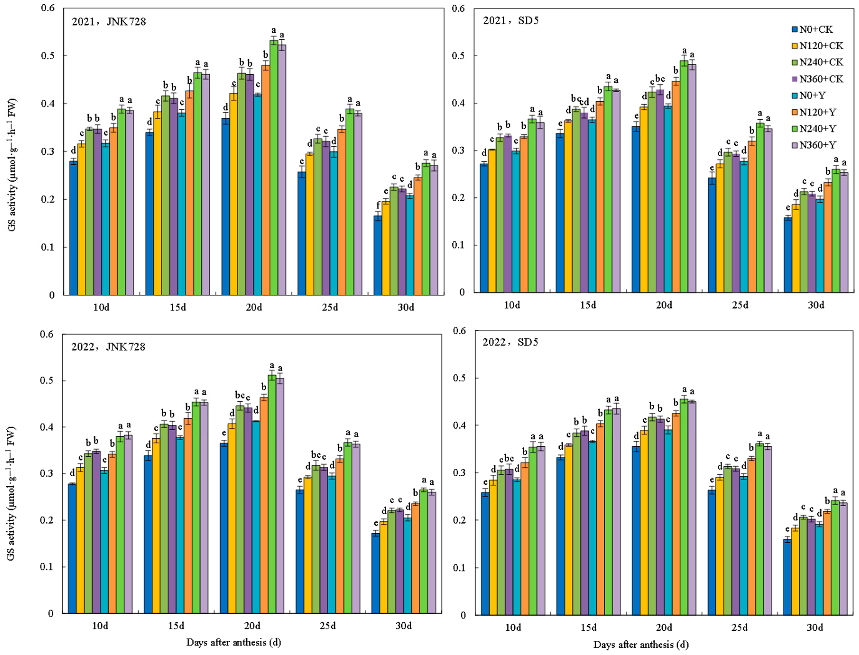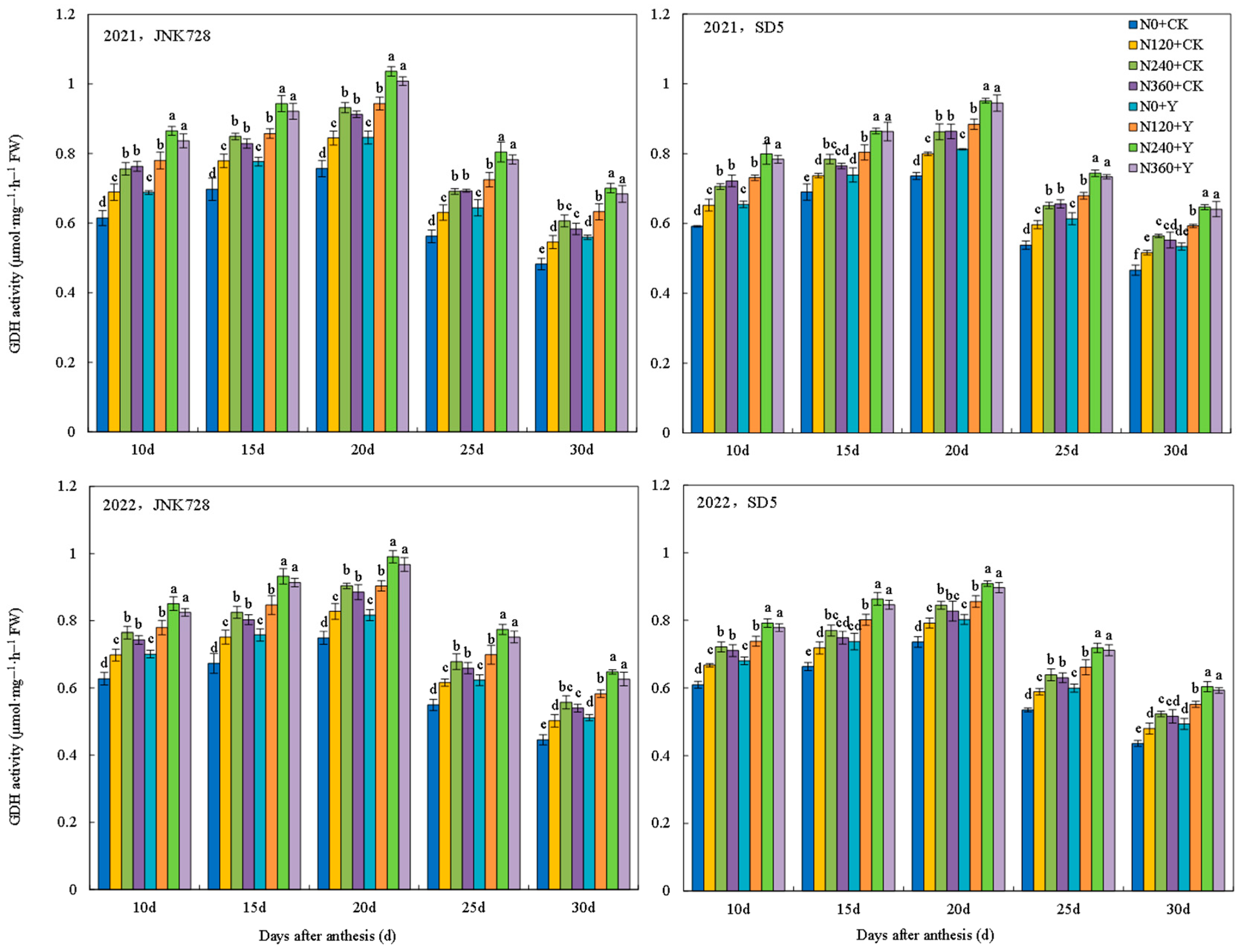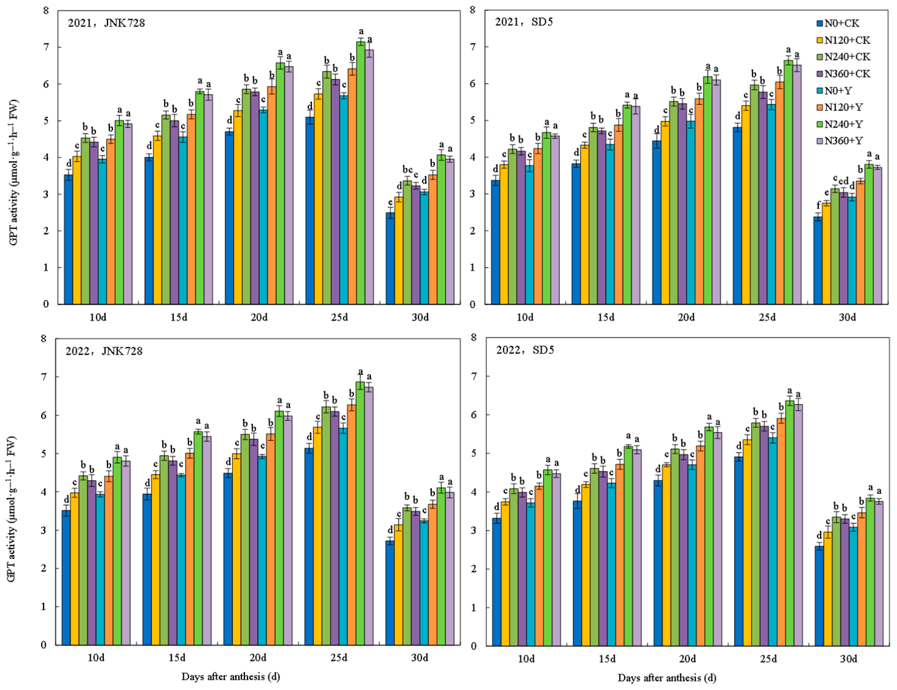 Glutamate synthetase (GS), glutamate dehydrogenase (GDH), and glutamate-pyruvate transaminase (GPT) are key enzymes regulating maize nitrogen metabolism. The activities of GS, GDH, and GPT in grains under different treatments all followed a single-peak curve during the filling stage, for which GS and GDH peaked at 20 days after anthesis (DAA), while GPT peaked at 25 DAA (Figure 23, Figure 24 and Figure 25). Nitrogen fertilizer and chemical regulation significantly affected nitrogen metabolism enzymes activities under high planting density. With increasing nitrogen rate, the activities of GS, GDH, and GPT significantly increased during grain filling stages, but no further increase was observed under excessive nitrogen (N360). Chemical regulation increased the activities of GS (20 DAA), GDH (20 DAA), and GPT (25 DAA) by 12.7%, 9.8%, and 11.3%, respectively. These results indicated that appropriate nitrogen application and chemical regulation can significantly improve the activities of grain GS, GDH, and GPT under high planting density, enhancing grain nitrogen metabolism capacity.