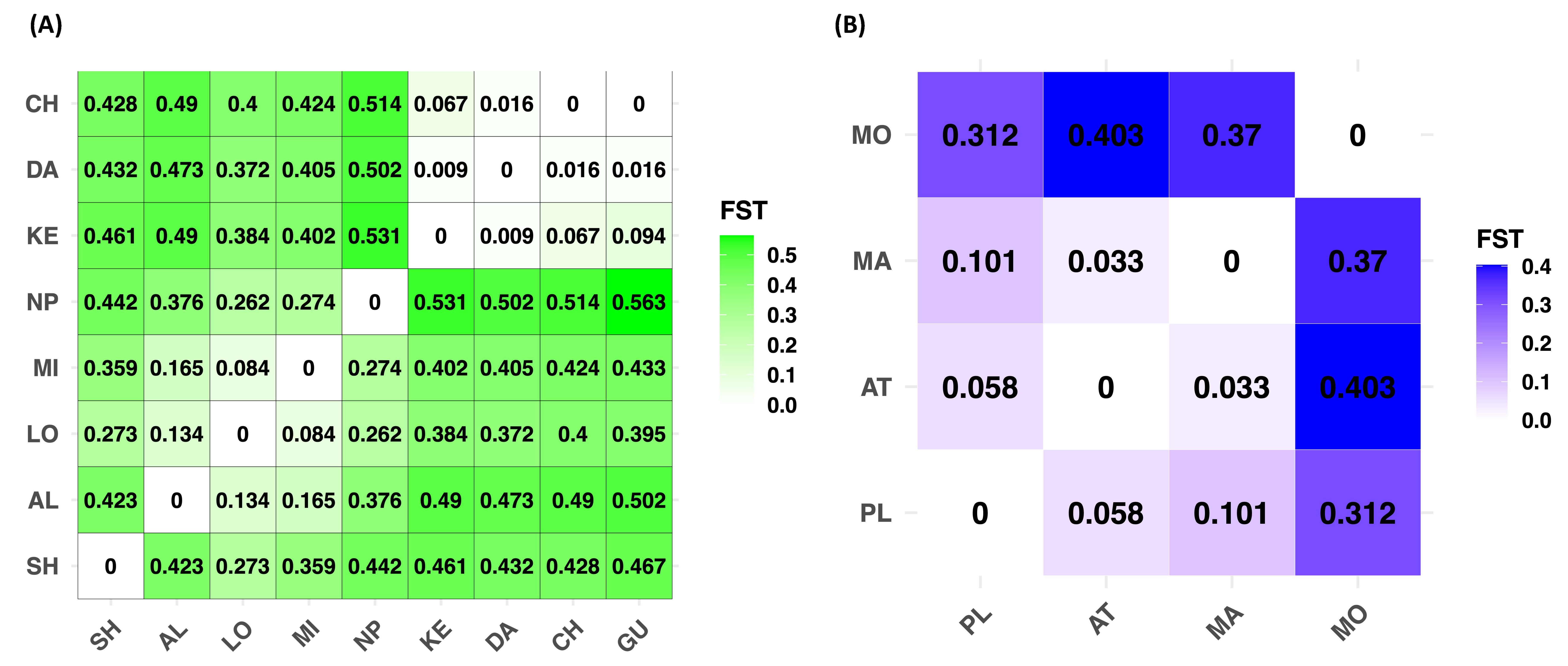 | Source of Variation | df | Sum of Squares | Mean Squares | Estimated Variance | Percentage of Variation | Fixation Index |